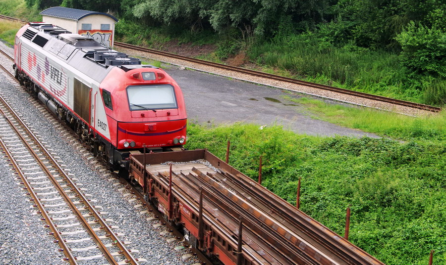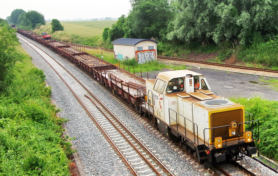 queue du train T1T2 avec la rame de finition et ramassage des coupons de rail de 18 m avec la E 4027 - 92 87 0 004 027-4 F-VFLI aux ponts de Bray à Jussy le 12-06-2018