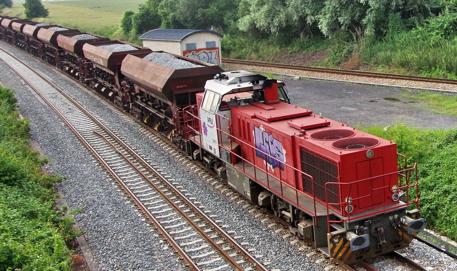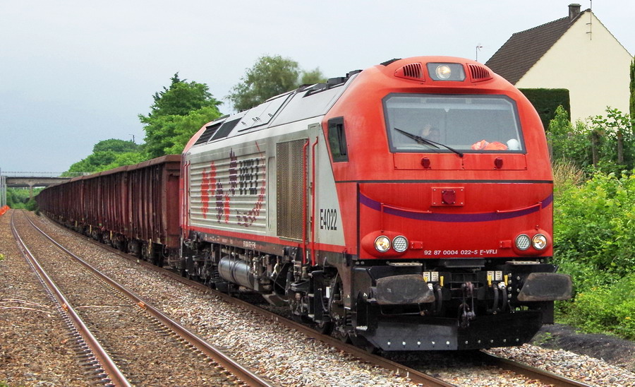 retour du train n°T1T2 rame de tombereaux avec la Euro 4022 de VFLI aux ponts de Bray à Jussy le 12-06-2018