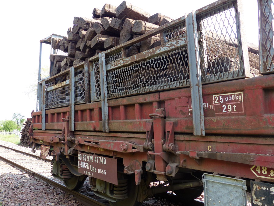 sur un wagon plat à bogies n°80 87 979 4 774-0 Uas R55 5 F-SNCF-LM pour ramasser les traverses usées.