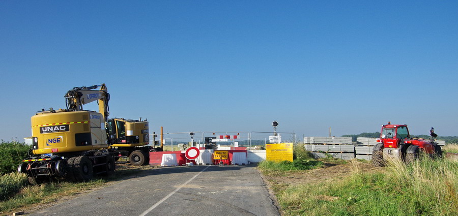l'ensemble des travaux pour le PN n°11 à Harbonnière avec la présence d'engins pour la mise en place des plaques en béton dite "berlinoises" pour éviter les coulées de terre ou de boue