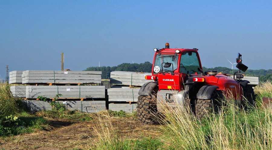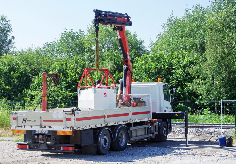 Elévateur LOXAM rouge en location pour le transport des berlinoises au niveau du PN n°11 à Harbonnière