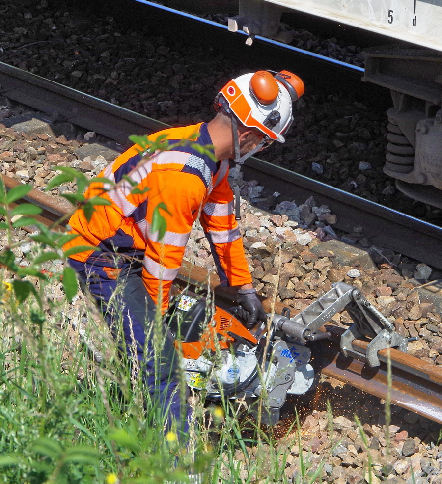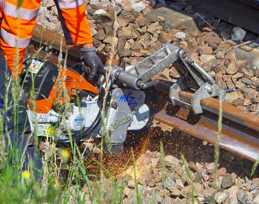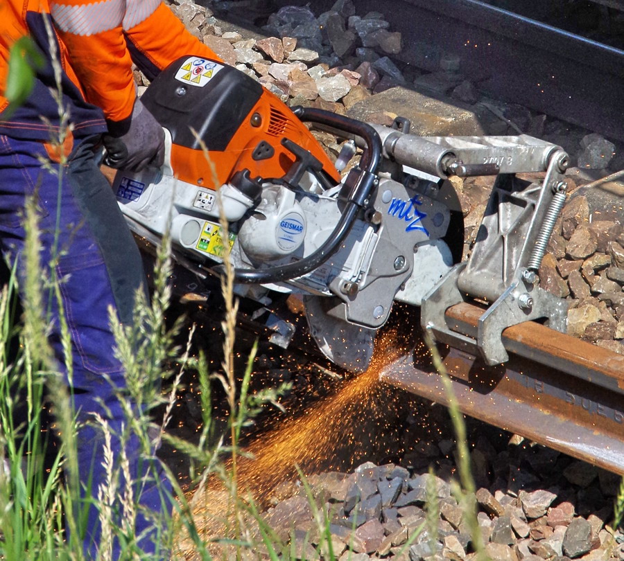 tronçonnage d'un LRS pour mettre une éclisse à 6 trous avec une tronçonneuse de rails ultra légère de Geismar de type MTZ