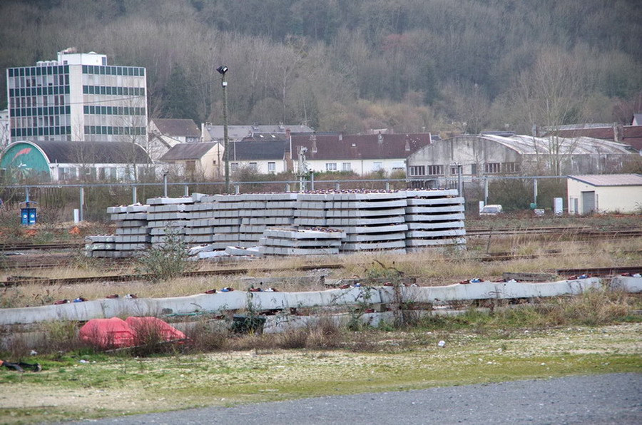 base de travaux pour ETF en gare de Laon avec le stock de traverses en béton