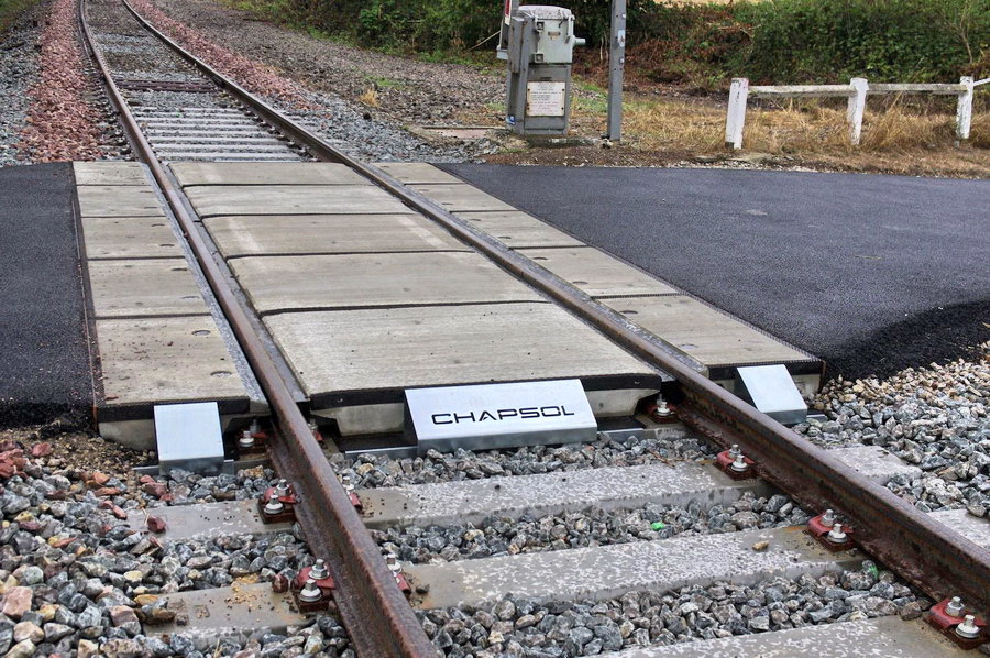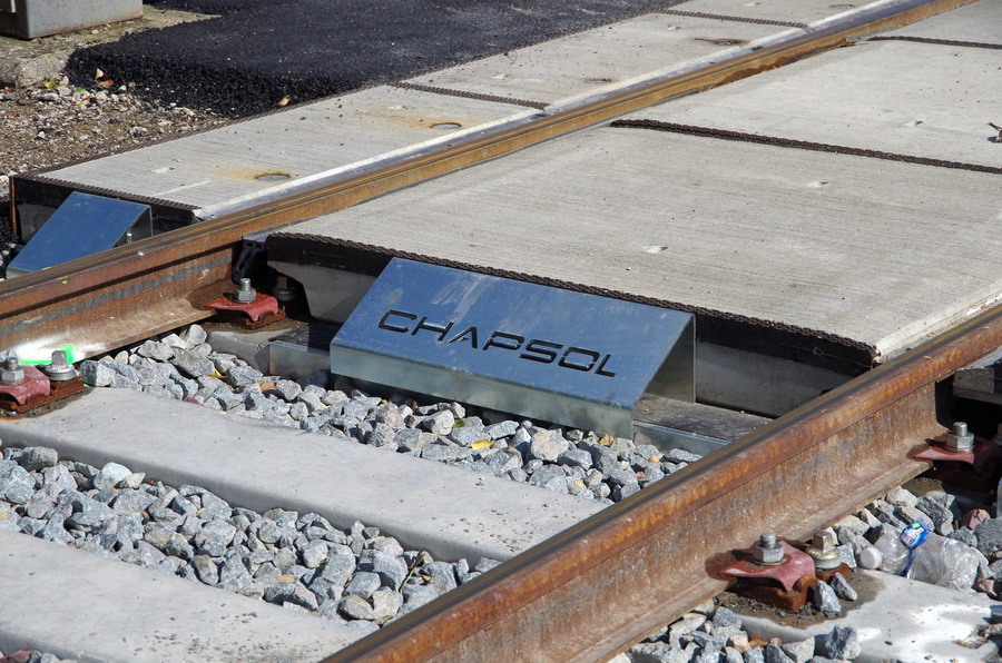 Cette solution a été retenue par la SNCF pour plusieurs réalisations sur le réseau ferré. Les raisons de ce choix ont reposé sur la rapidité de pose des dalles préfabriquées en béton afin de pénaliser le moins possible la circulation routière. La solution à attaches classiques permet de faciliter les interventions de dépannage et d'entretien par rapport à d'autres systèmes de maintien du rail.