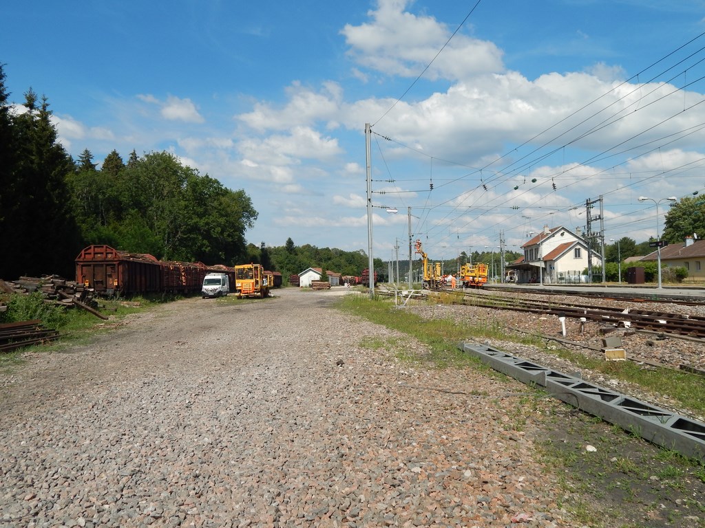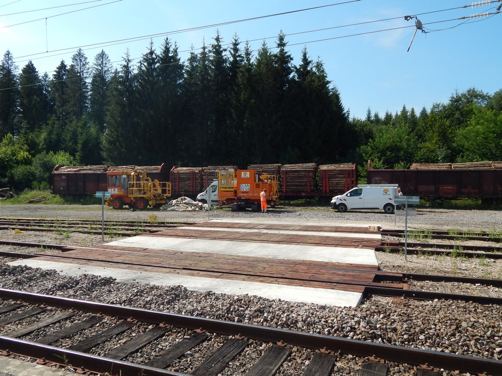 le 18/7/2018 Colas rail intervient sur la caténaire en gare d'Andelot en montagne (39)