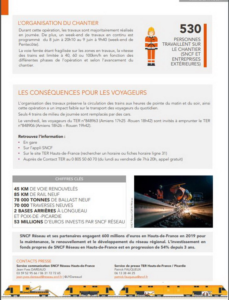 Ainsi, le rail, les traverses et le ballast sont entièrement renouvelés sur les deux voies, sur 45km entre Amiens et Serqueux.