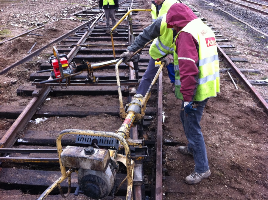 Dévissage des éclisses tenant les rails entre eux : Gilbert (arc et Senans) ne touche plus terre, mais il y est arrivé quand même.