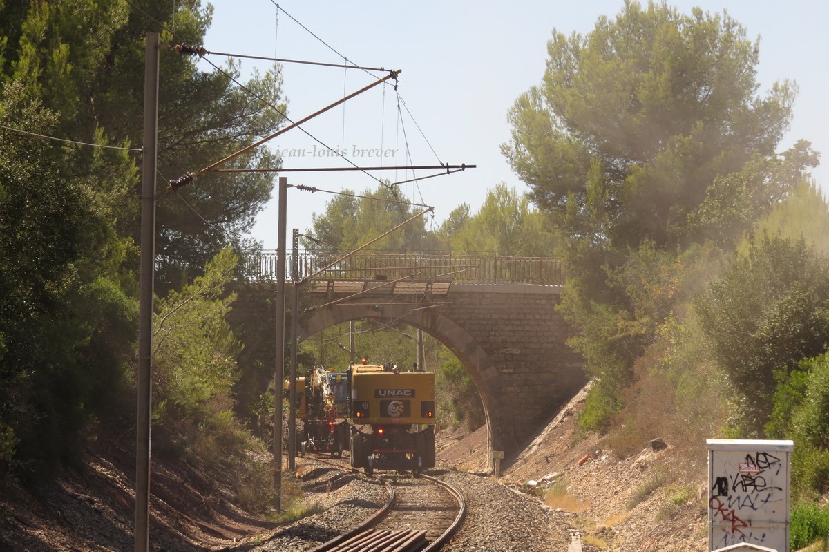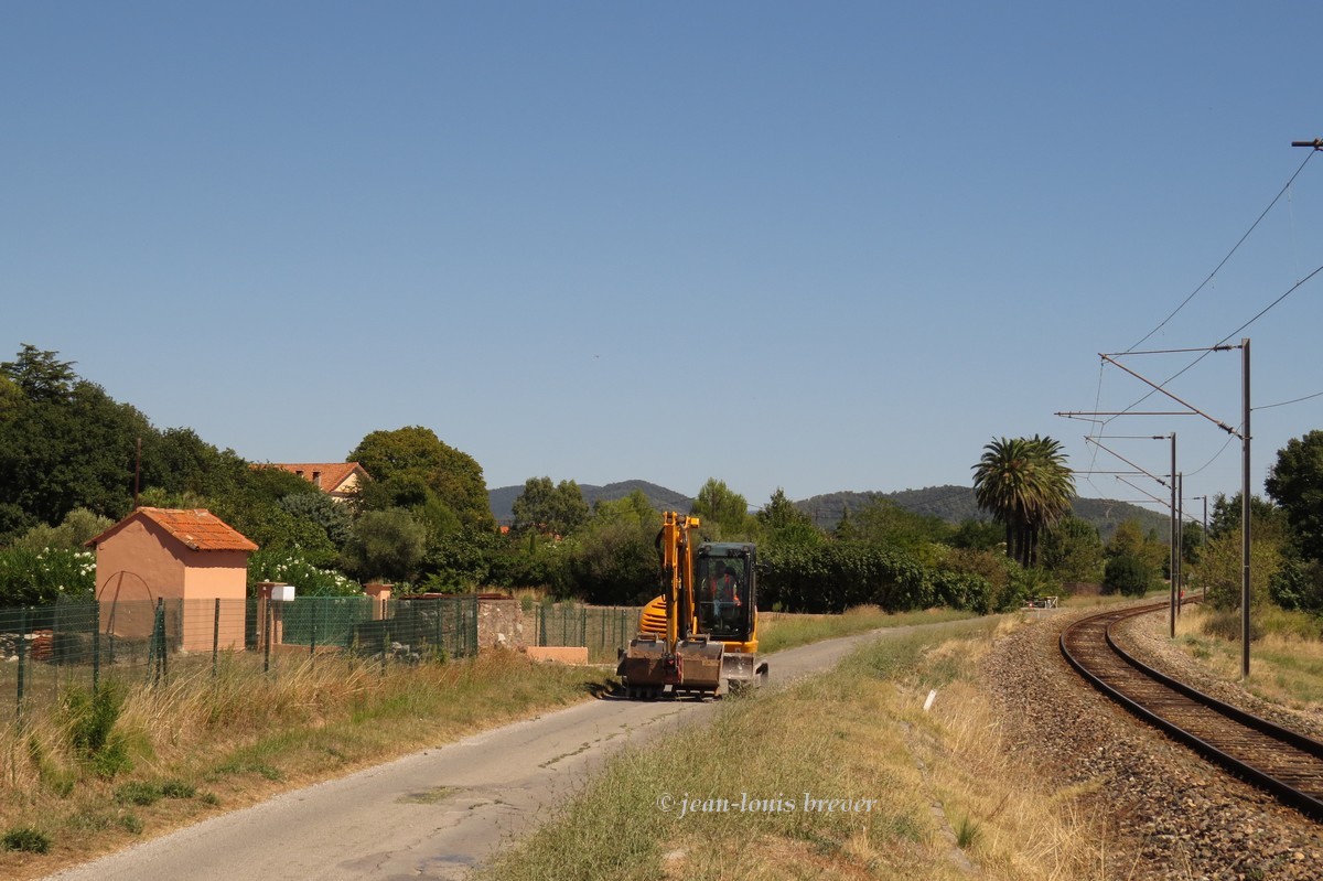 Effectivement, il y a en gare de Hyères une rame de trémies SGW, un chargeur Colas, le "village de conténeurs" ainsi qu'un tas de ballast neuf. Un peu plus loin en sortant de la gare on trouve un autre tas de ballast. Sur la ligne, j'ai rien vu du côté de Hyères.