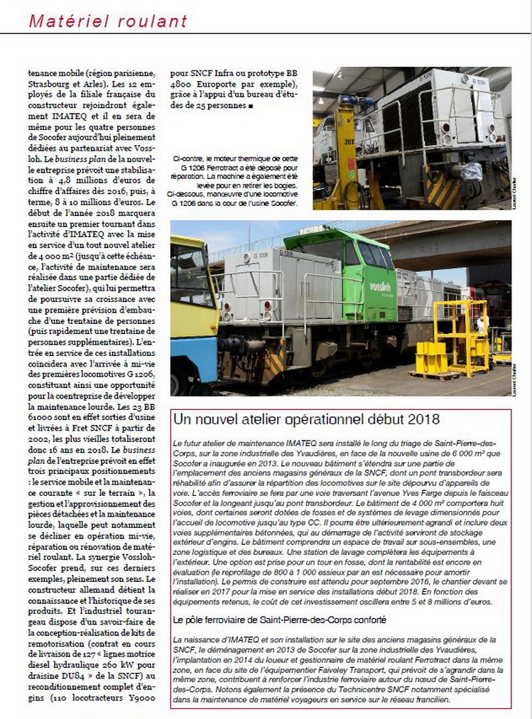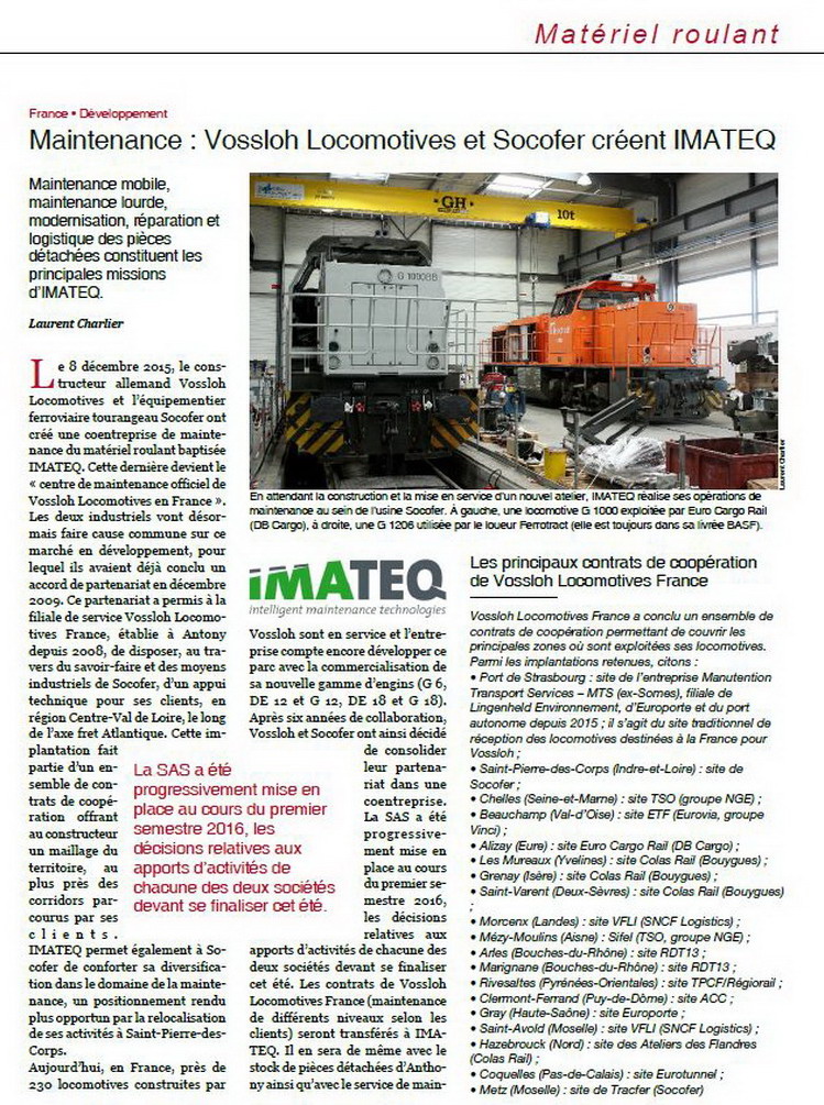 La société IMATEQ est l’un des prestataires de maintenance de locomotives, leader sur le marché français. Cette co-entreprise de Vossloh Locomotives France et de Socofer a été créée en décembre 2015. Depuis cent ans Vossloh Locomotives construit des locomotives diesel sur le site de Kiel en Allemagne. Cette expérience a été mise à profit en France à partir de 2001 en proposant des prestations de service globales et en particulier dans le domaine de la traction diesel. Depuis cette date Vossloh Locomotives évolue avec succès en France, où elle dispose de ses propres centres d’intervention et de maintenance et depuis 2011 elle coopère avec Socofer, la principale entreprise française traditionnelle de matériels roulants ferroviaires. La société Socofer a été créée pour construire des matériels roulants dans les années soixante après reprise des établissements Billard, un constructeur de draisines ferroviaires depuis 1920. Depuis cette date Socofer s’est également spécialisée dans les prestations de maintenance.