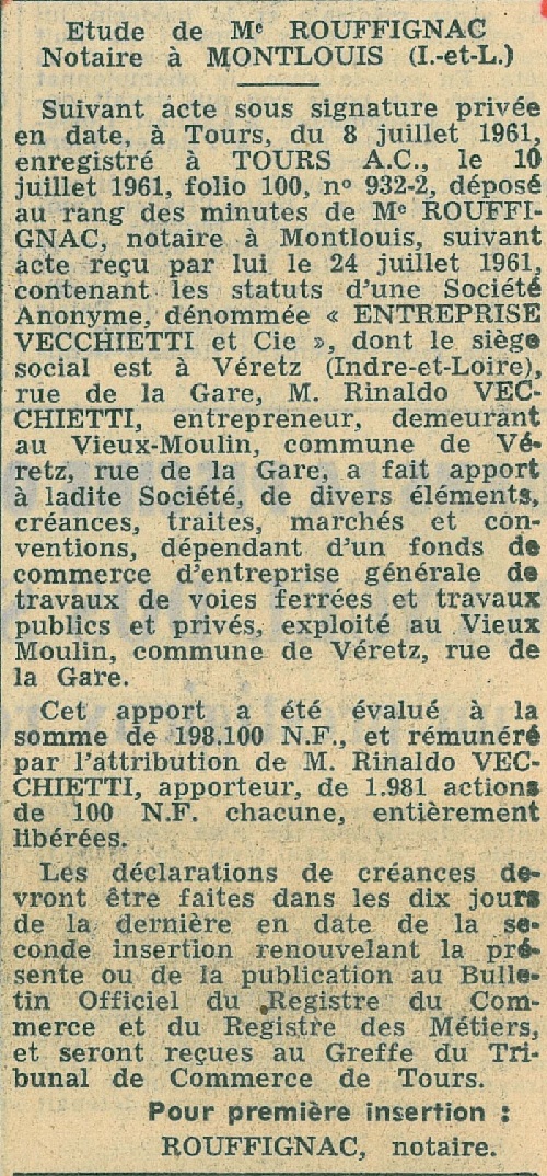10-07-1961- Naissance de l'Entreprise Vecchietti & Cie