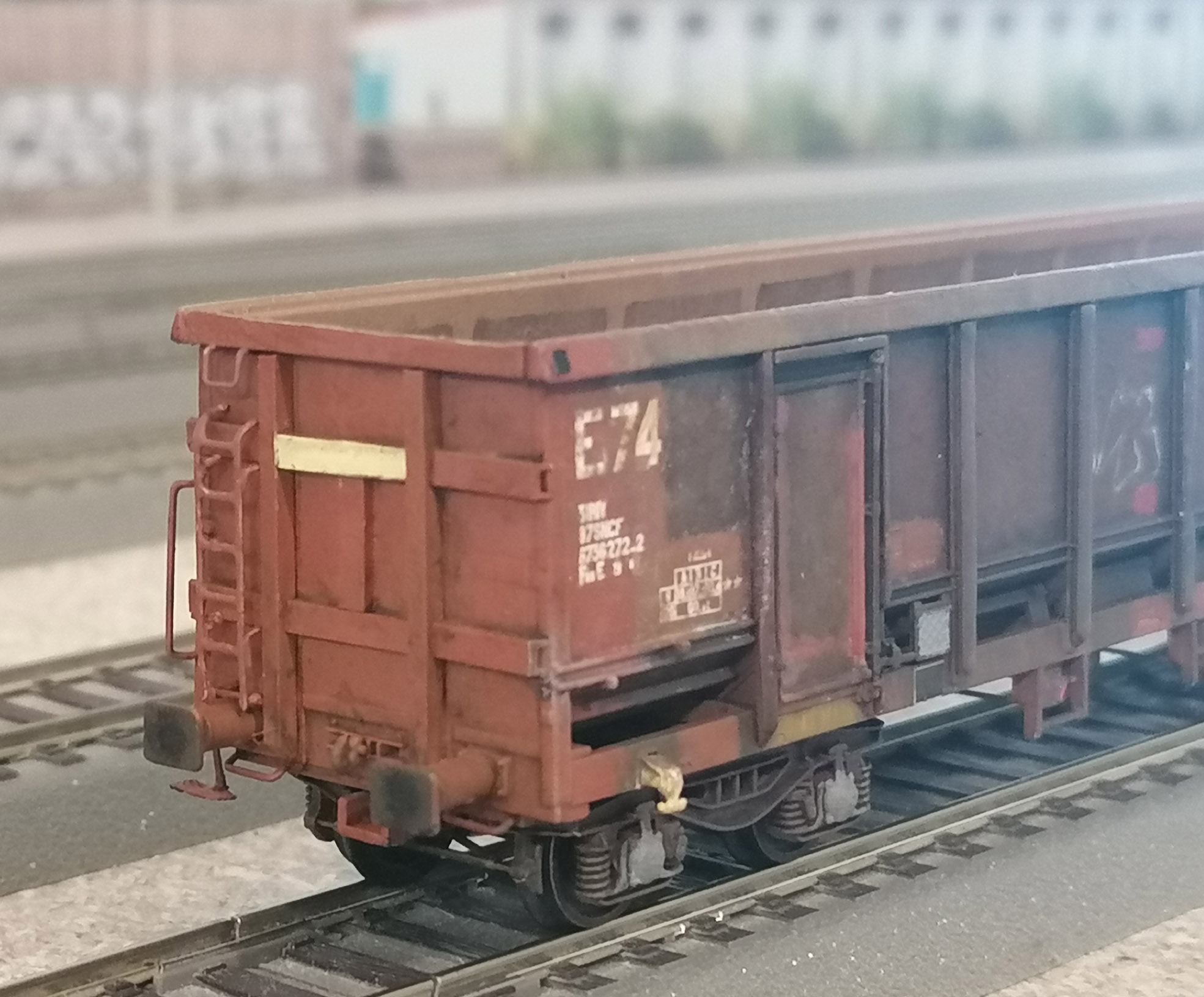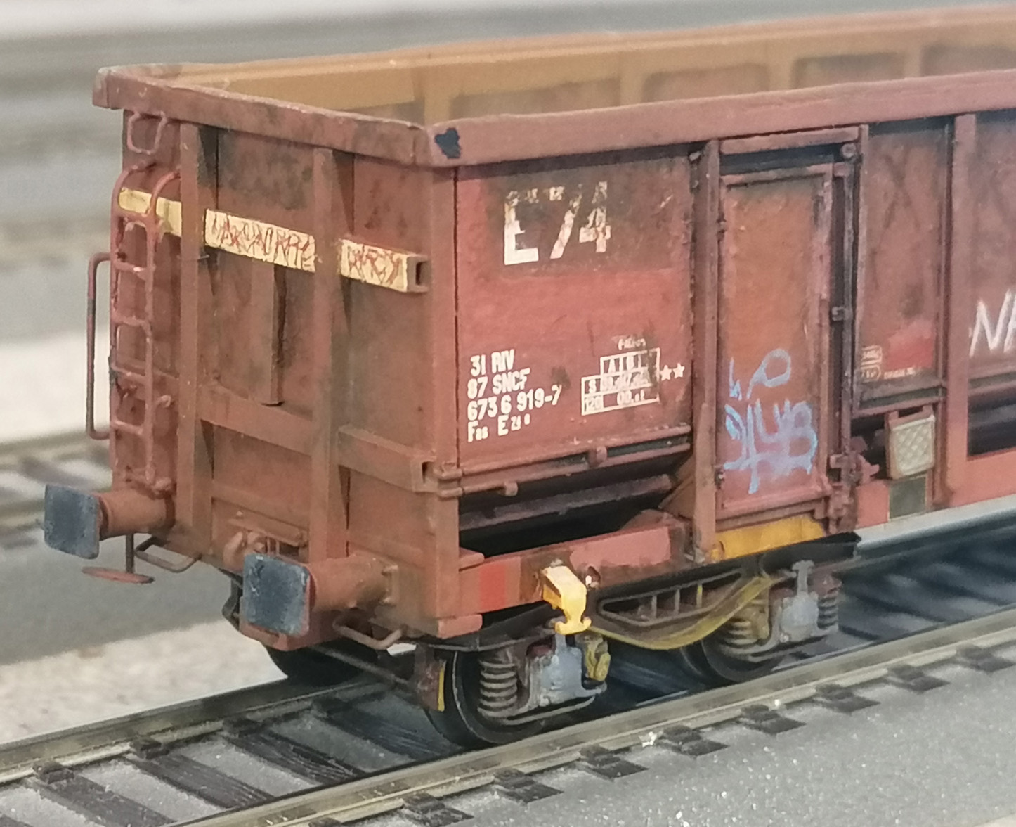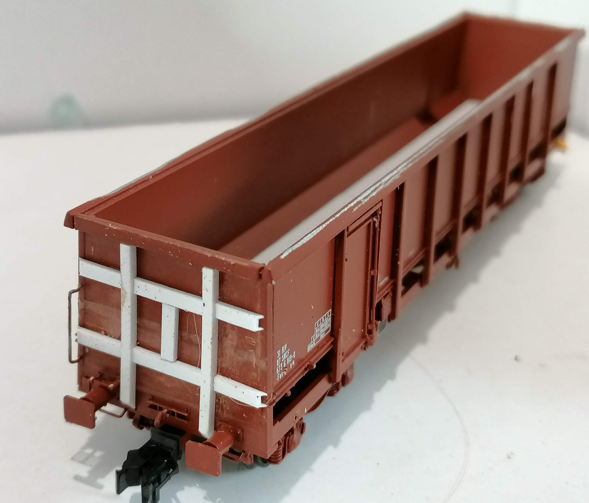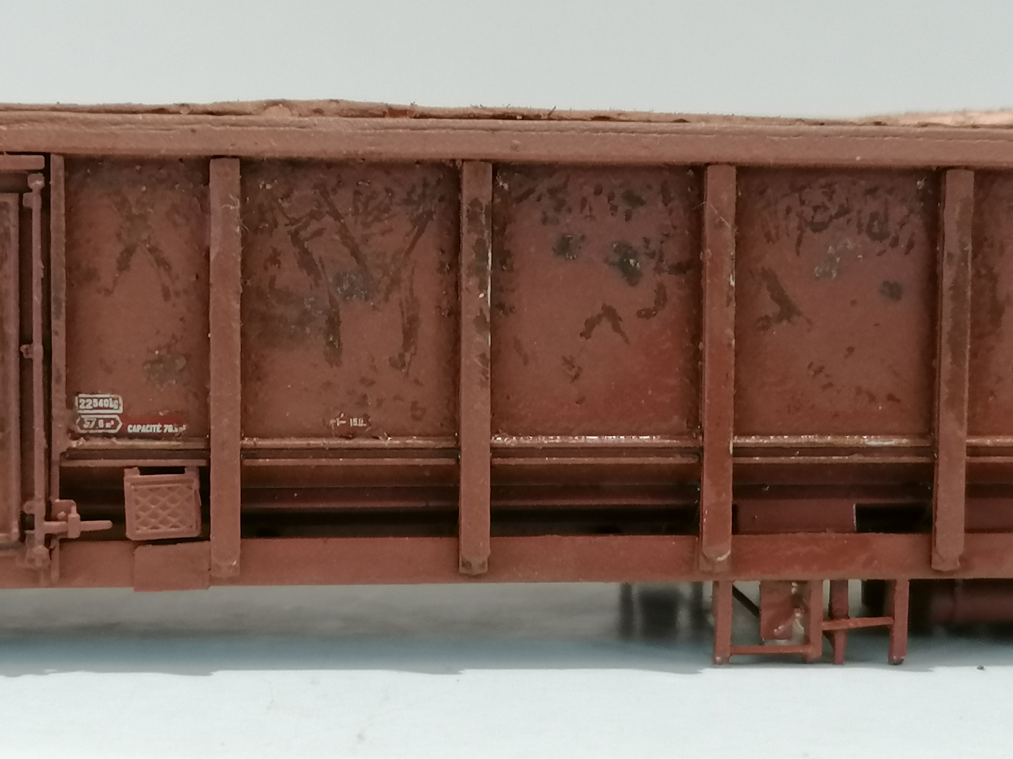 Les côtés du wagon tombereau E74 refait en platicard et avec des échelles SMD