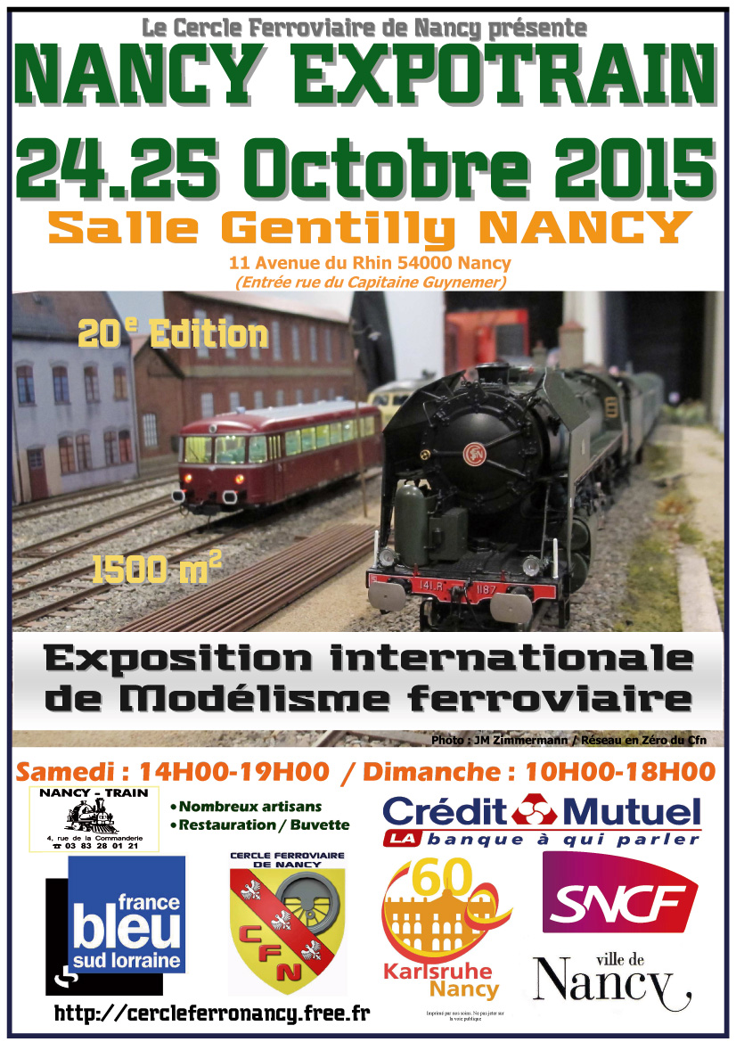 Les membres du Cercle Ferroviaire de Nancy vous annoncent que la prochaine exposition aura les 24 et 25 octobre 2015 à la salle des fêtes de Gentilly .