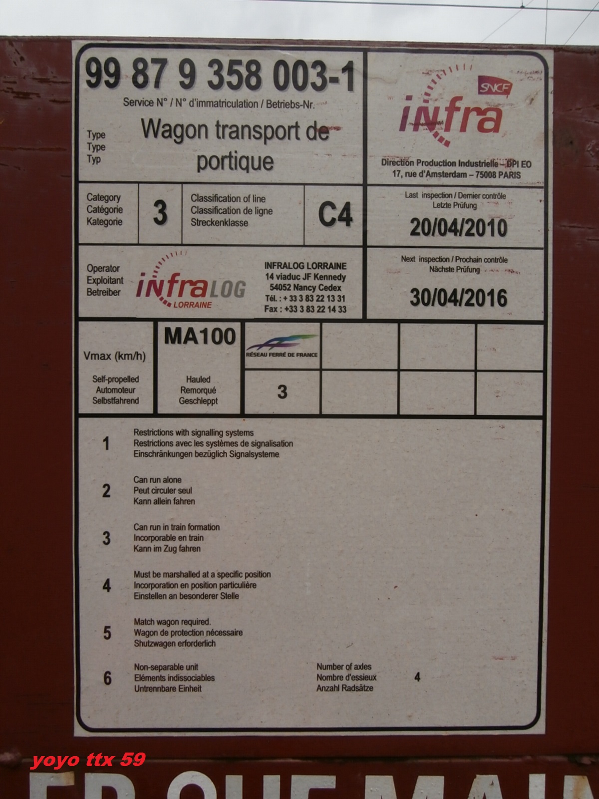 .Voici les nouvelles immatriculations des wagons.99 87 9358 001-599 87 9358 002-399 87 9358 003-1Ces trois wagons transportent les " PMC 1 , PMC 2 , PMC 3 ".Maintenant a voir si il n'y a pas d'autres triplettes de portiques