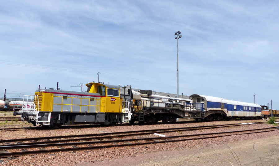 Voici le wagon PF3 - 80 87 979 9 375-1 Uas W42 9 - F-SNCFR - SNCF RESEAU ex SNCF-RO gare d'attache Caen avec sa voiture de cantonnement 50 87 979 3 008-4 Uas H55 0 F SNCF-MN encadré par le Y 8468 en livrée Infra et par une autre Y 8xxx Infra