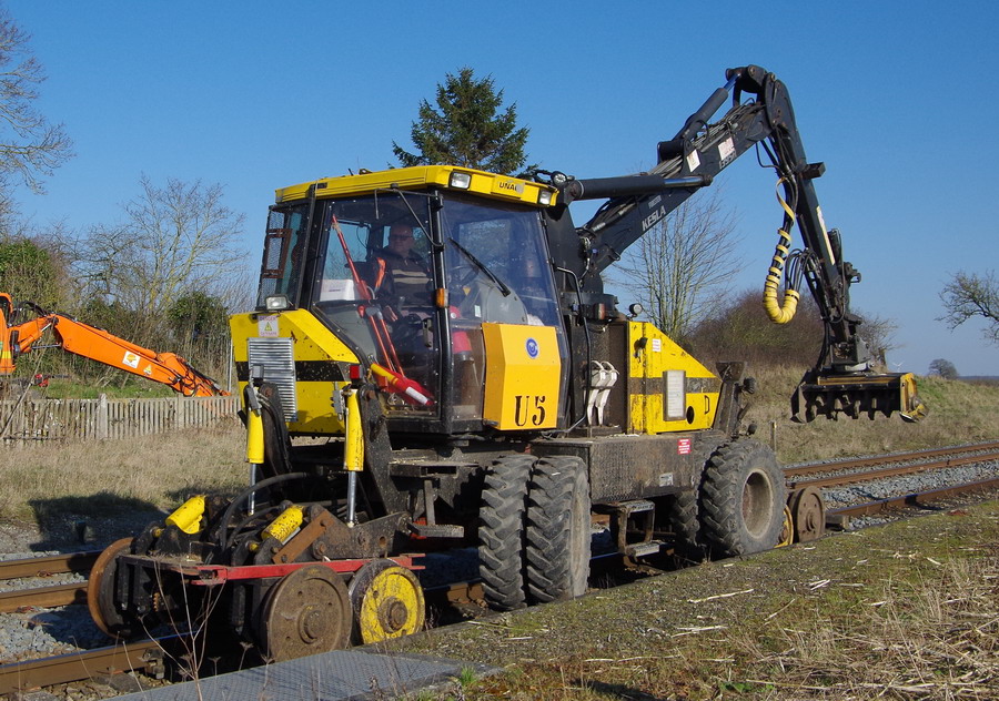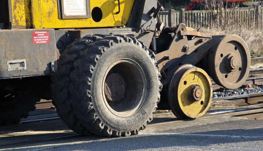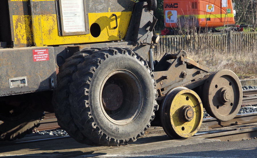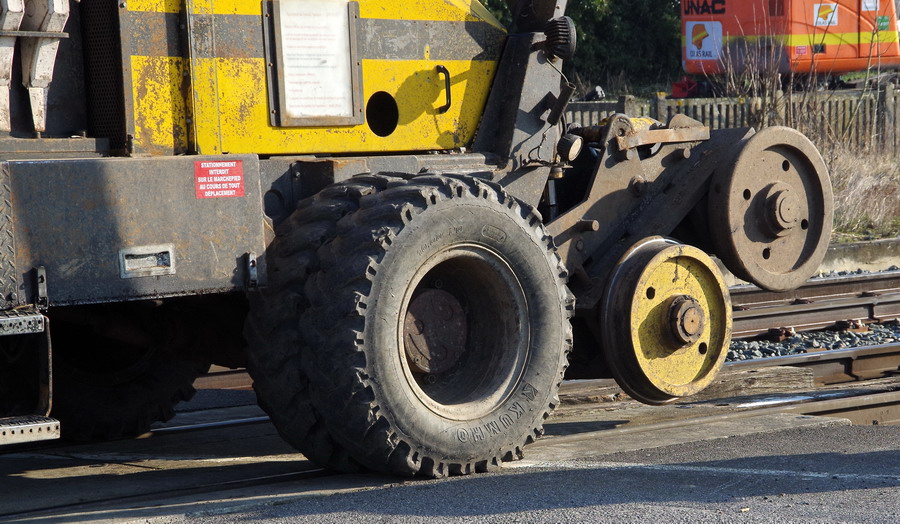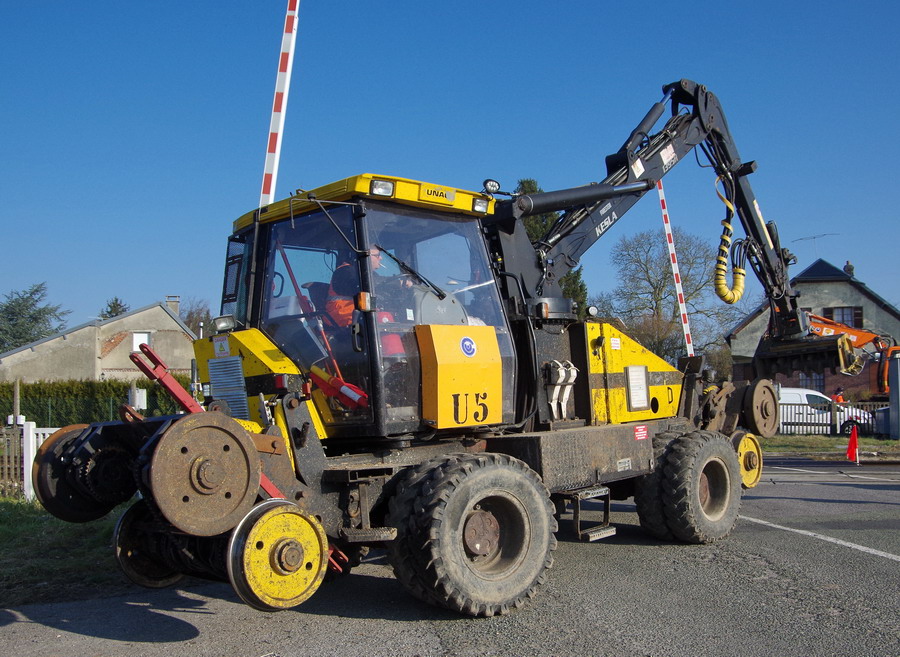 la débroussailleuse rail-route va se mettre sur les rails elle profite du passage a niveau pour se mettre sur les rail puis elle part sur la zone de chantier