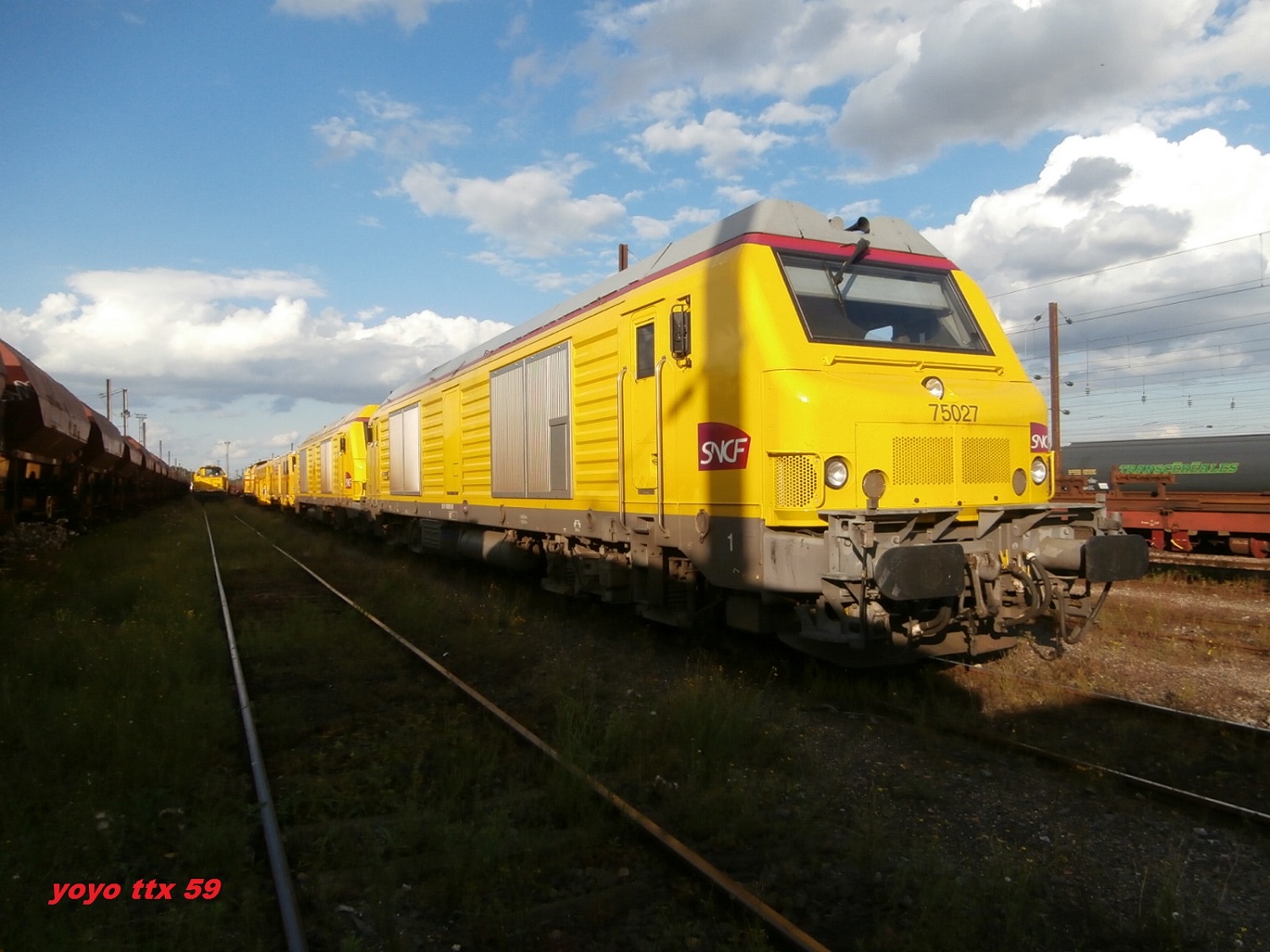 Vue hier au dépôt d'Achères, la BB 75027 vient de se voir appliquer une livrée jaune.