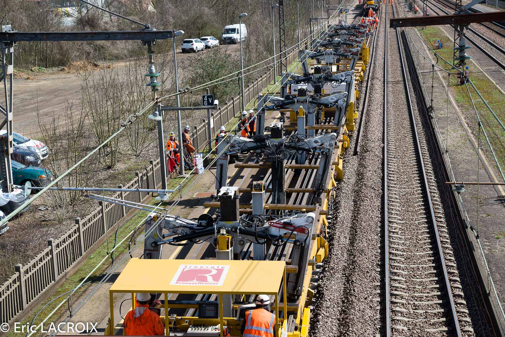 Couplage Wagon grue BRRAS Transalp Renouvellement à Villeneuve la Guyard en mars 2017.