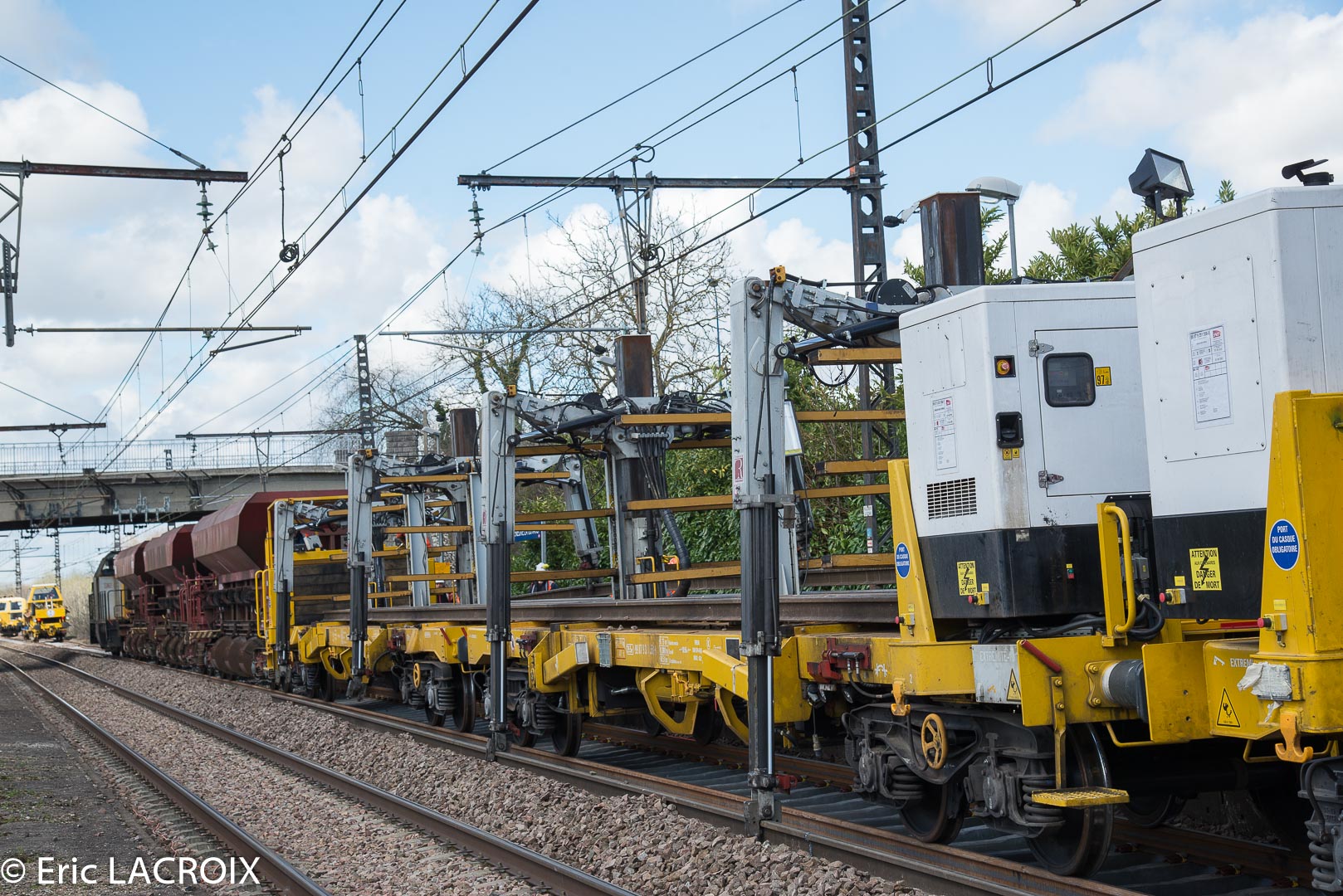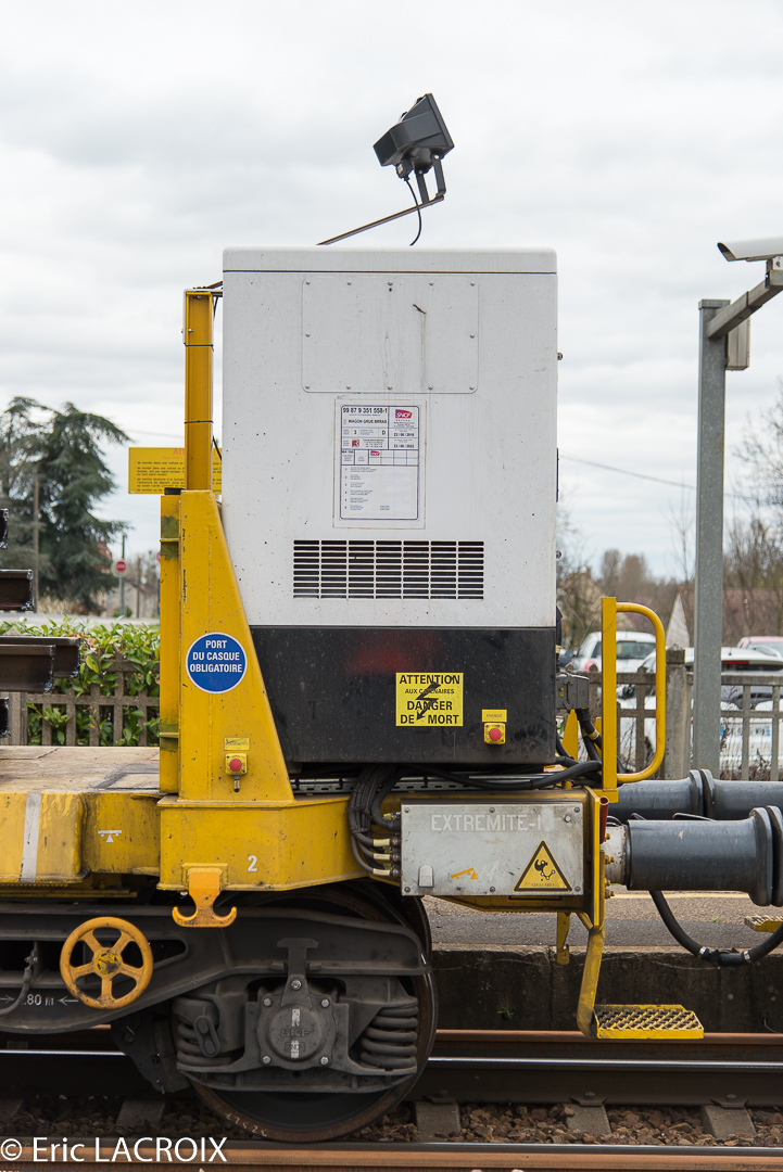 Couplage Wagon grue BRRAS Transalp Renouvellement à Villeneuve la Guyard en mars 2017.