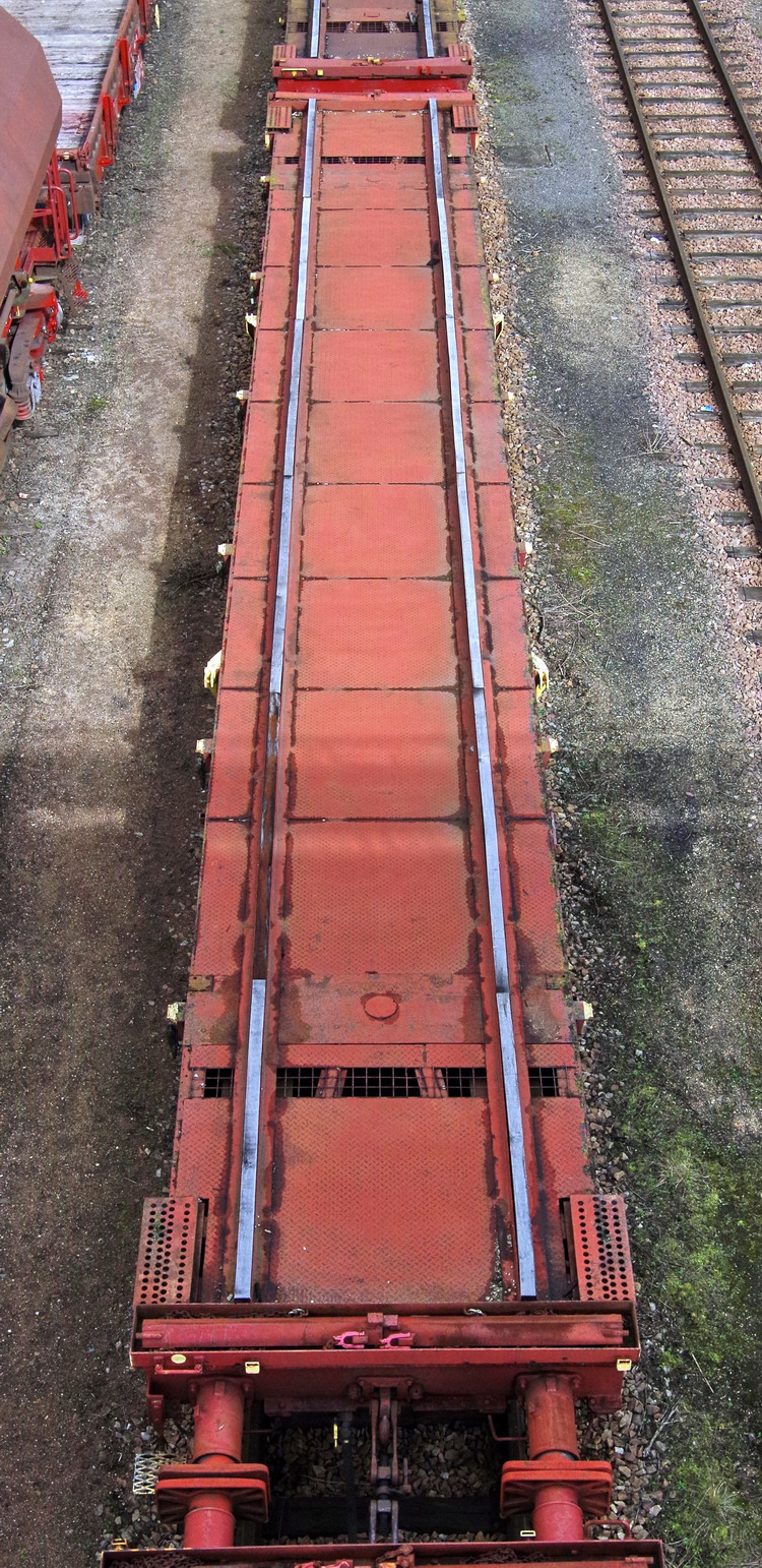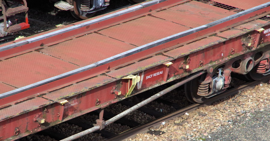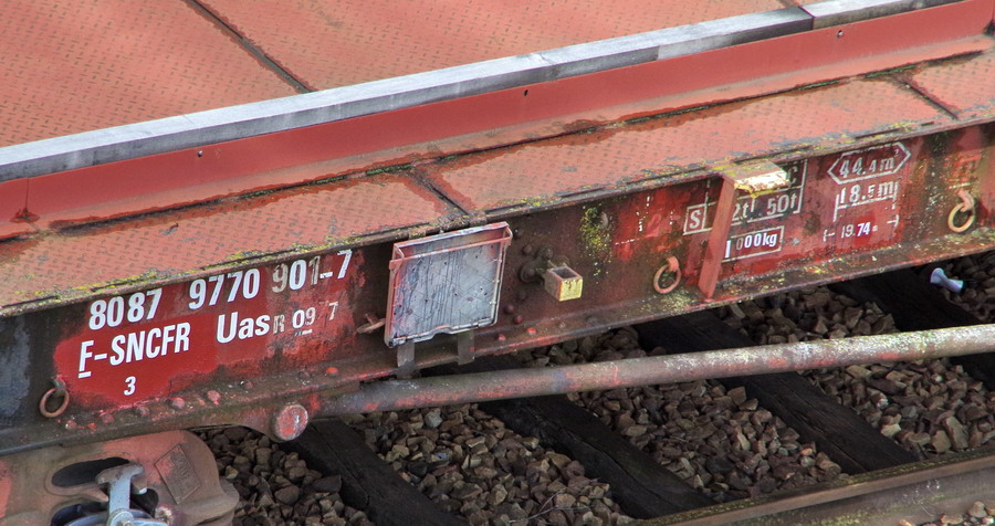 Voici le wagon 80 87 977 0 901-7 Uas R09 7 F SNCF-PSL Ã Saint Pierre des Corps le 16-09-2014 vide de chargement de traverses