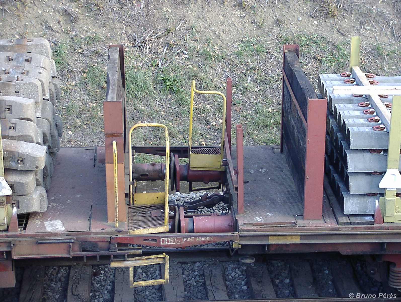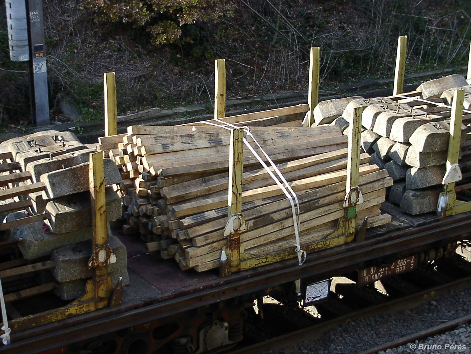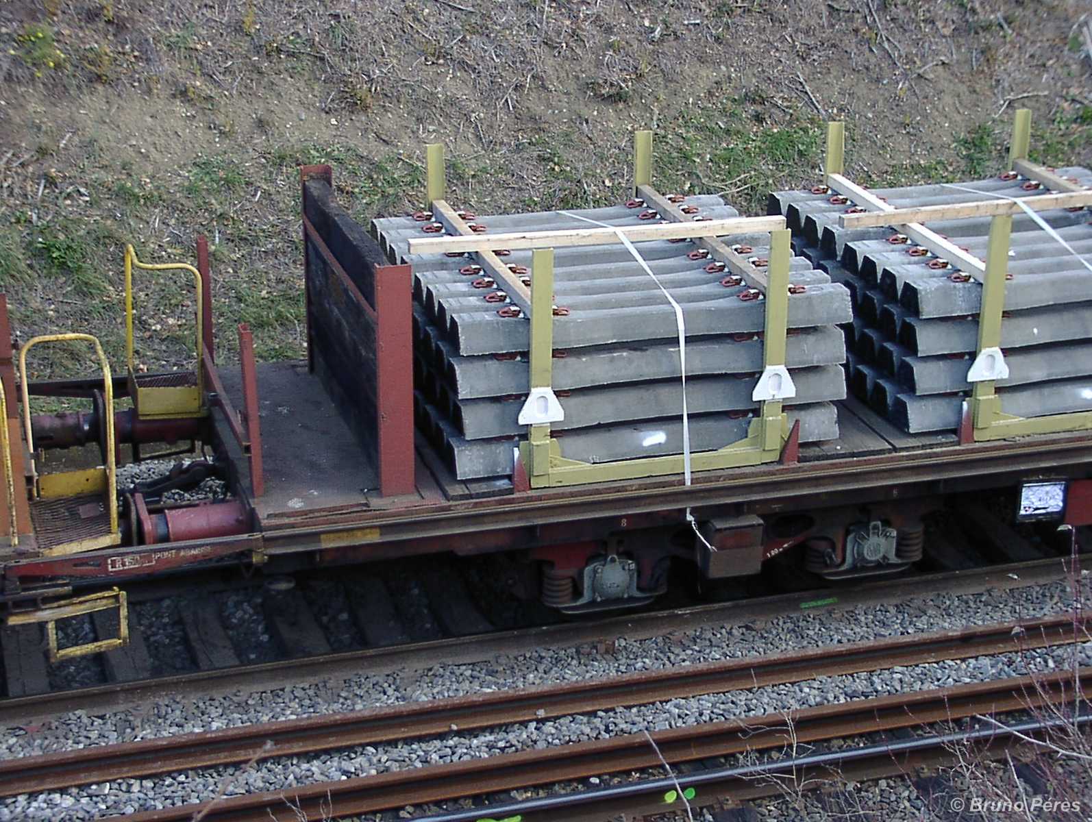 Voici quelques photos de plats chargés de traverses palettisées pour suites rapides. Ces palettes sont prises en charges sur chantier par des portiques circulant sur des rails fixés sur chaque flanc des wagons. Ces portiques alimentent le train de substitution SMD 80 (ETF ou Colas Rail), la TSV 21 GP (TSO et Colas Rail) ou le futur P95 d'ETF.