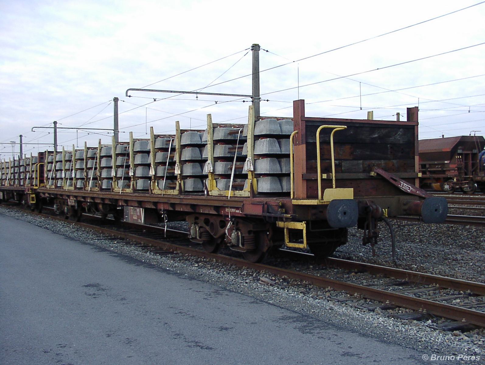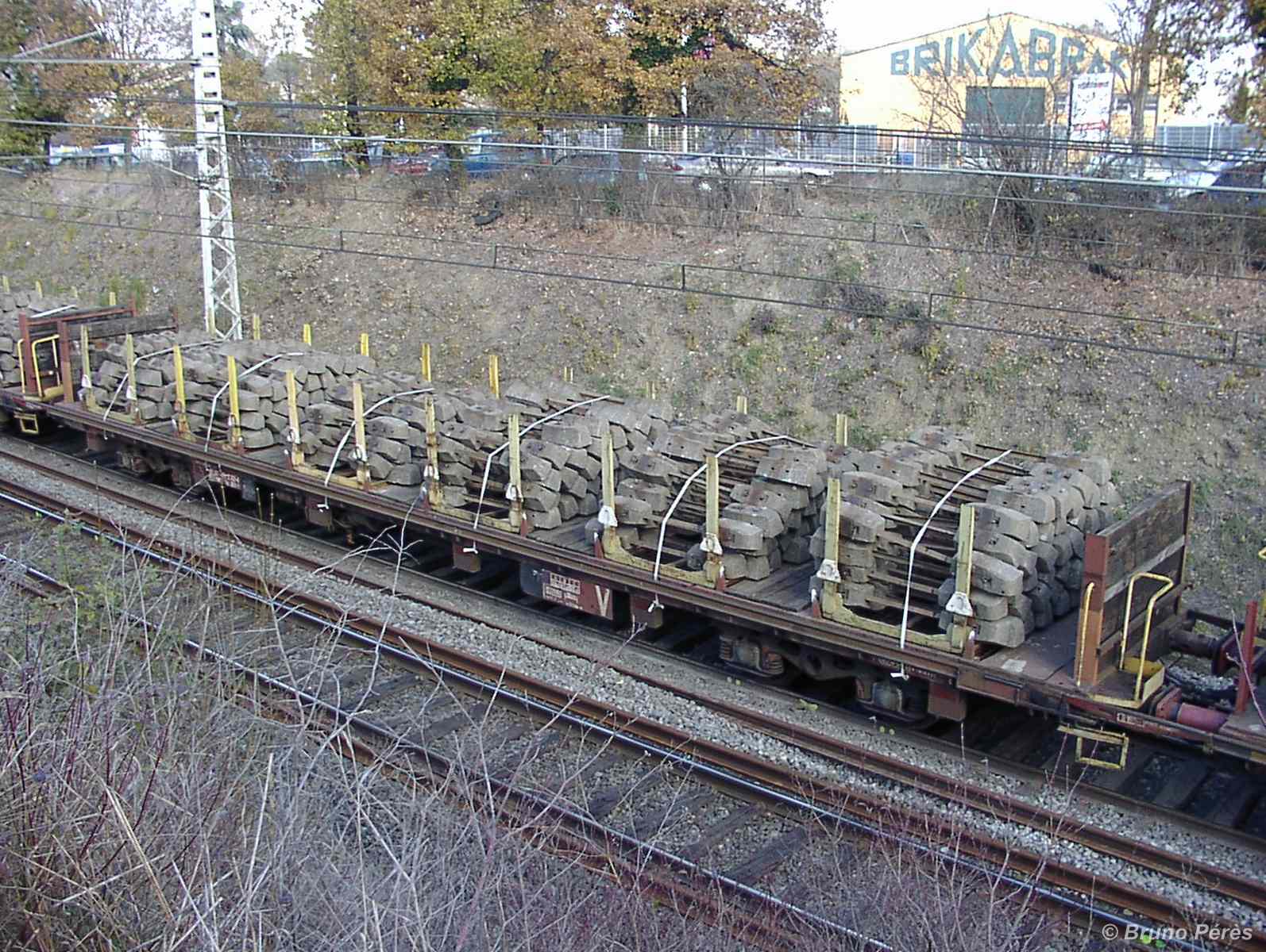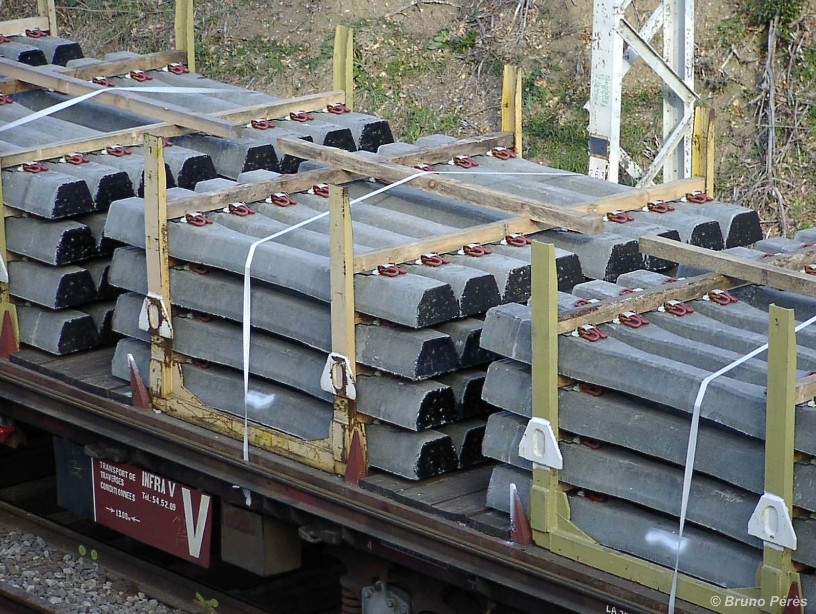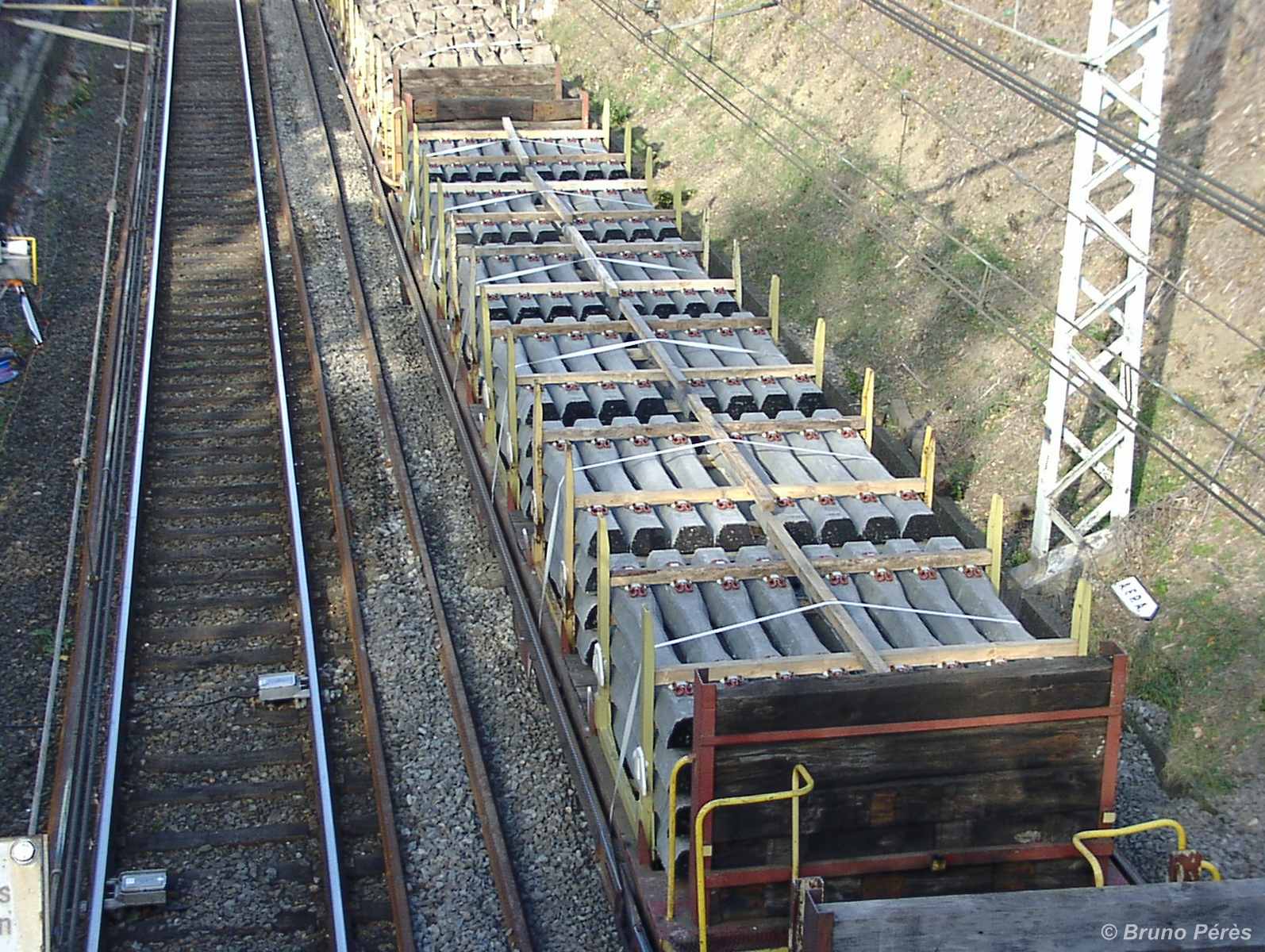 Voici quelques photos de plats chargés de traverses palettisées pour suites rapides. Ces palettes sont prises en charges sur chantier par des portiques circulant sur des rails fixés sur chaque flanc des wagons. Ces portiques alimentent le train de substitution SMD 80 (ETF ou Colas Rail), la TSV 21 GP (TSO et Colas Rail) ou le futur P95 d'ETF.