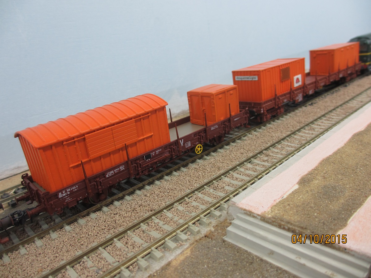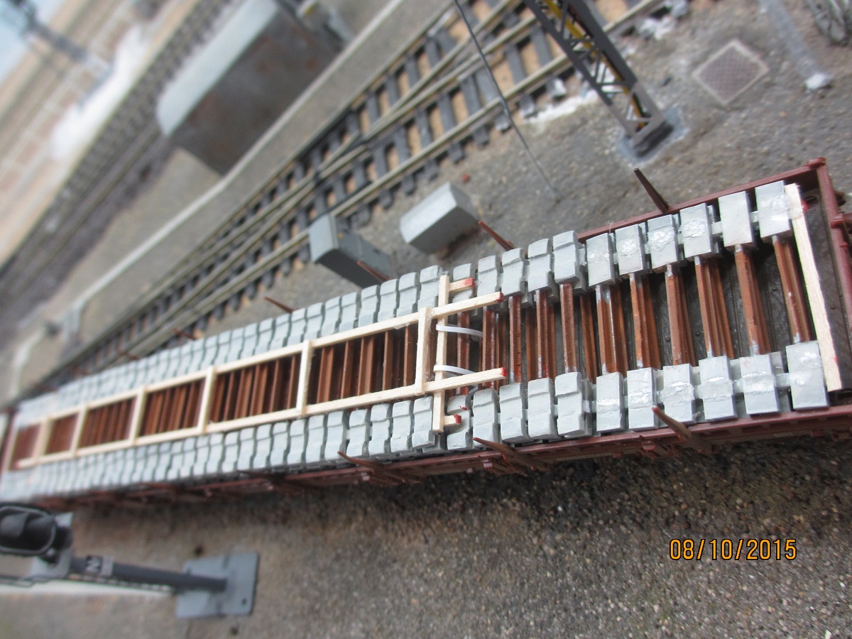 La reproduction des traverses bi-blocs a fait l'objet d'un article de ma part dans le RMF de juin 2006 : " des recettes pour vos plats : des chargements de traverses béton et bois". Le but de cet article était de réaliser des petites rames locales de trains de chantier, et d'en concevoir le chargement. Toujours d'après des photos réelles.