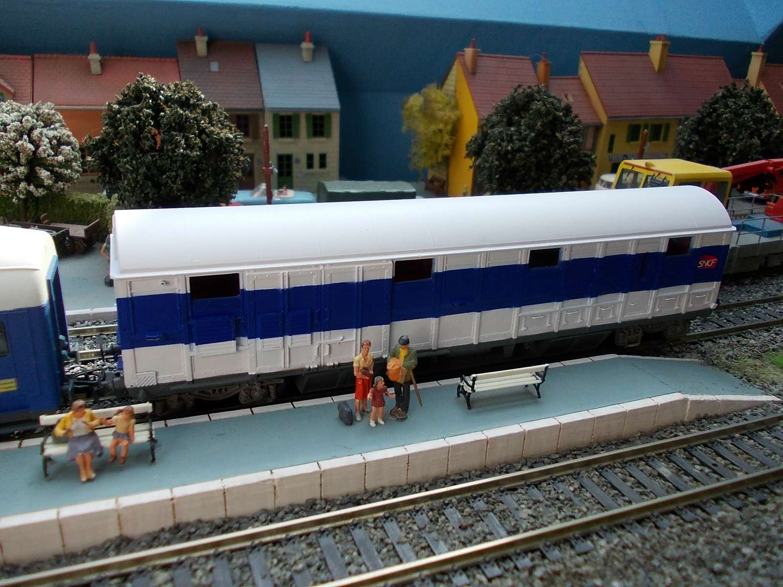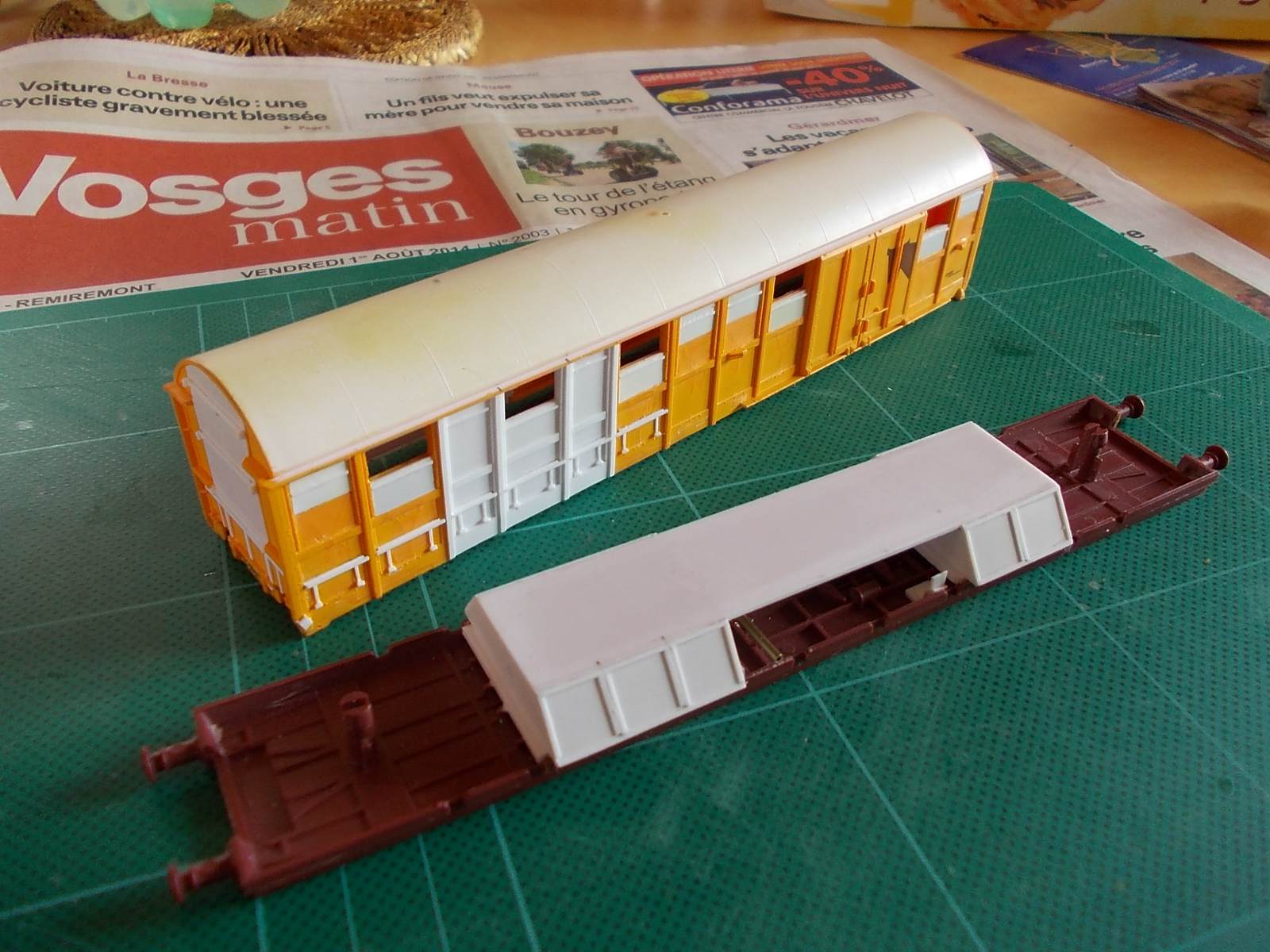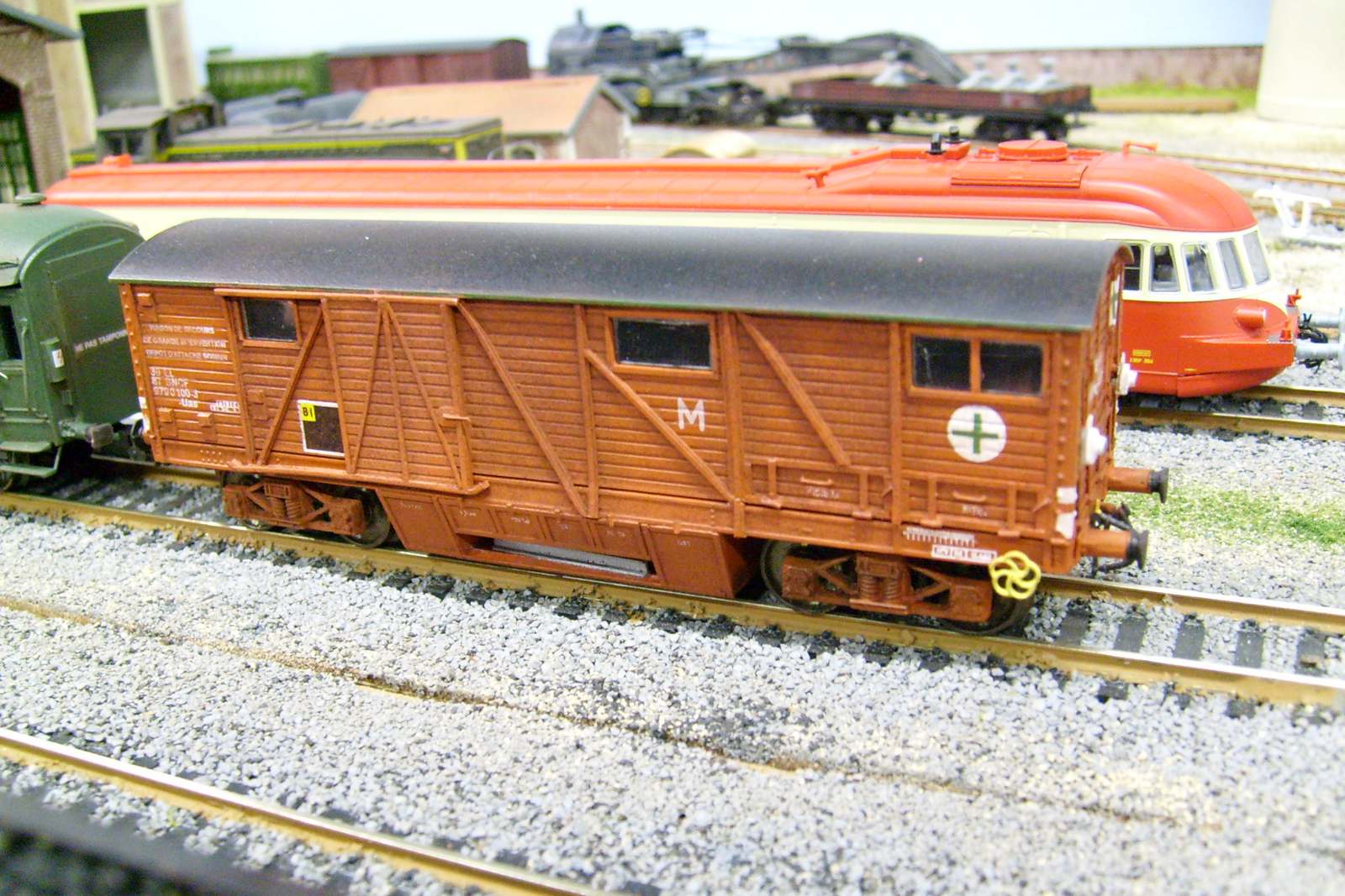 Autre variante de wagon de secours,la dernière livrée appliquée sur les wsgi.Sur une base de Jouef.