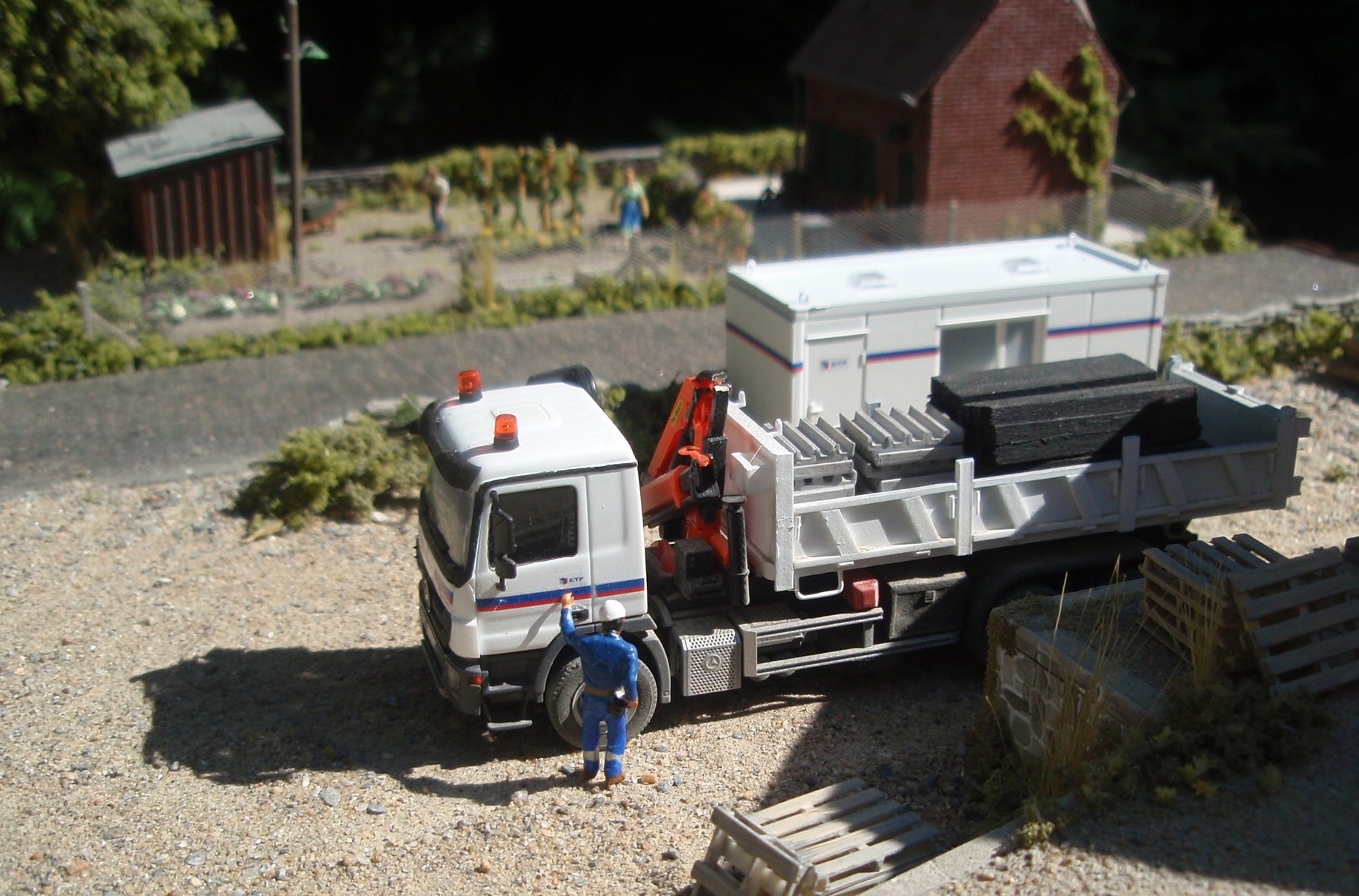 J'ai opté pour une Marrel longue à ridelles (fabrication maison en Evergreen. Je me suis basée sur une benne similaire équipant un Kerax de l'Européenne de travaux ferroviaires). A noter les stabilisateurs à l'arrière, les coffres, etc.