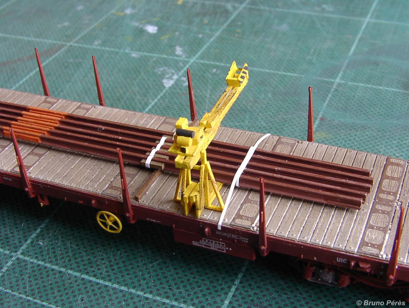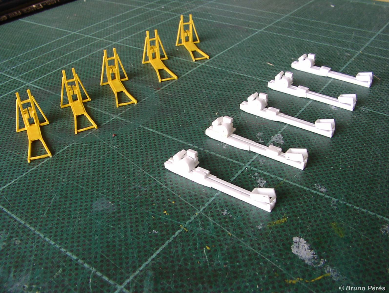 C'est en chantier depuis pas mal de temps déjà, mais il va falloir que je m'y remette puisque, saison aidant, je dispose d'un peu plus de temps. Ils seront déclinés en différentes variantes : avec ou sans moteur, montés ou pied d'un côté et potence de l'autre, version SNCF, ETF ou Colas Rail. Certains seront destinés au décor, d'autre aux chargements, en position de travail ou démontés.