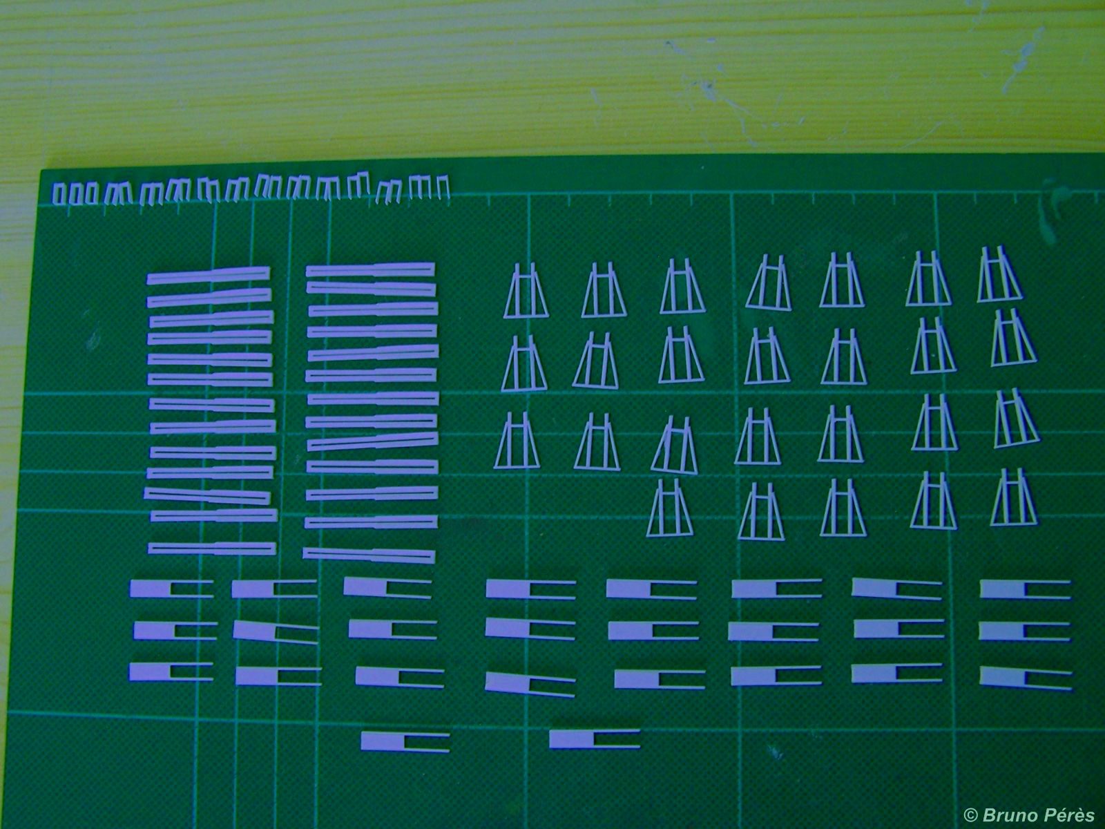 Les travaux d'hier soir ! Finalement, j'ai pris la décision de ne pas changer grand chose par rapport au proto en dehors de la façon de monter les pièces, histoire de me faciliter la tâche. En effet,je voulais biseauter certaines pièces obliques pour qu'elles se collent au mieux aux pièces verticales, mais difficile de le faire facilement et correctement quand ces montants obliques ont une section de 0,5mm ! A suivre ...