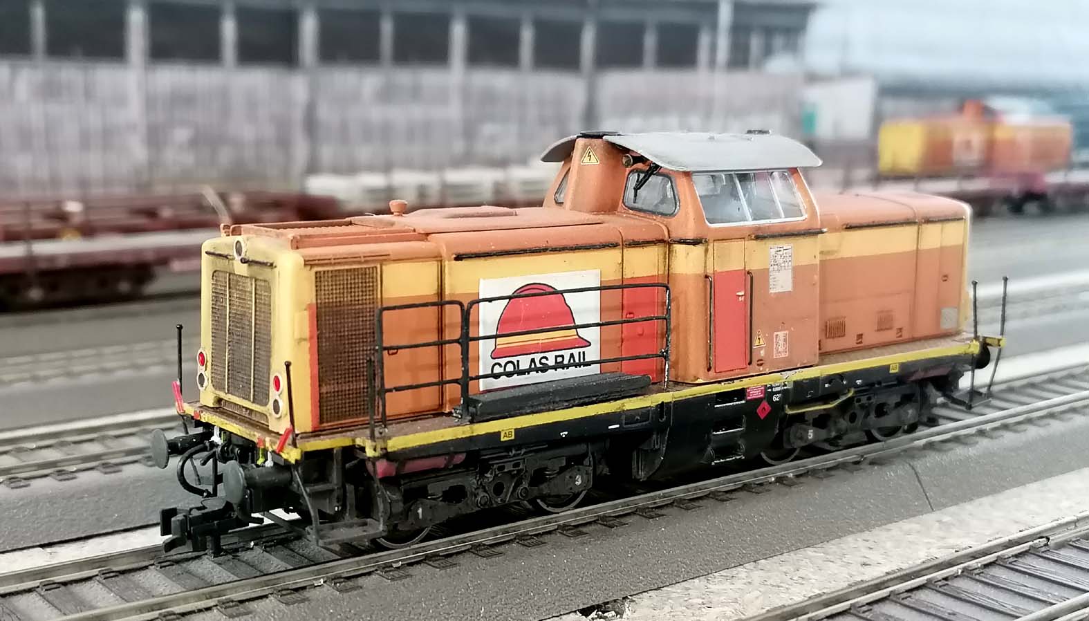 Autre locomotive V211 Colas rail patinée. La patine est faite en s'inspirant de modèles très délavés. J'avais envie de montrer des portes repeintes. J'avais croisé un modele équivalent à Pleine Fougères mais il était plus marron !