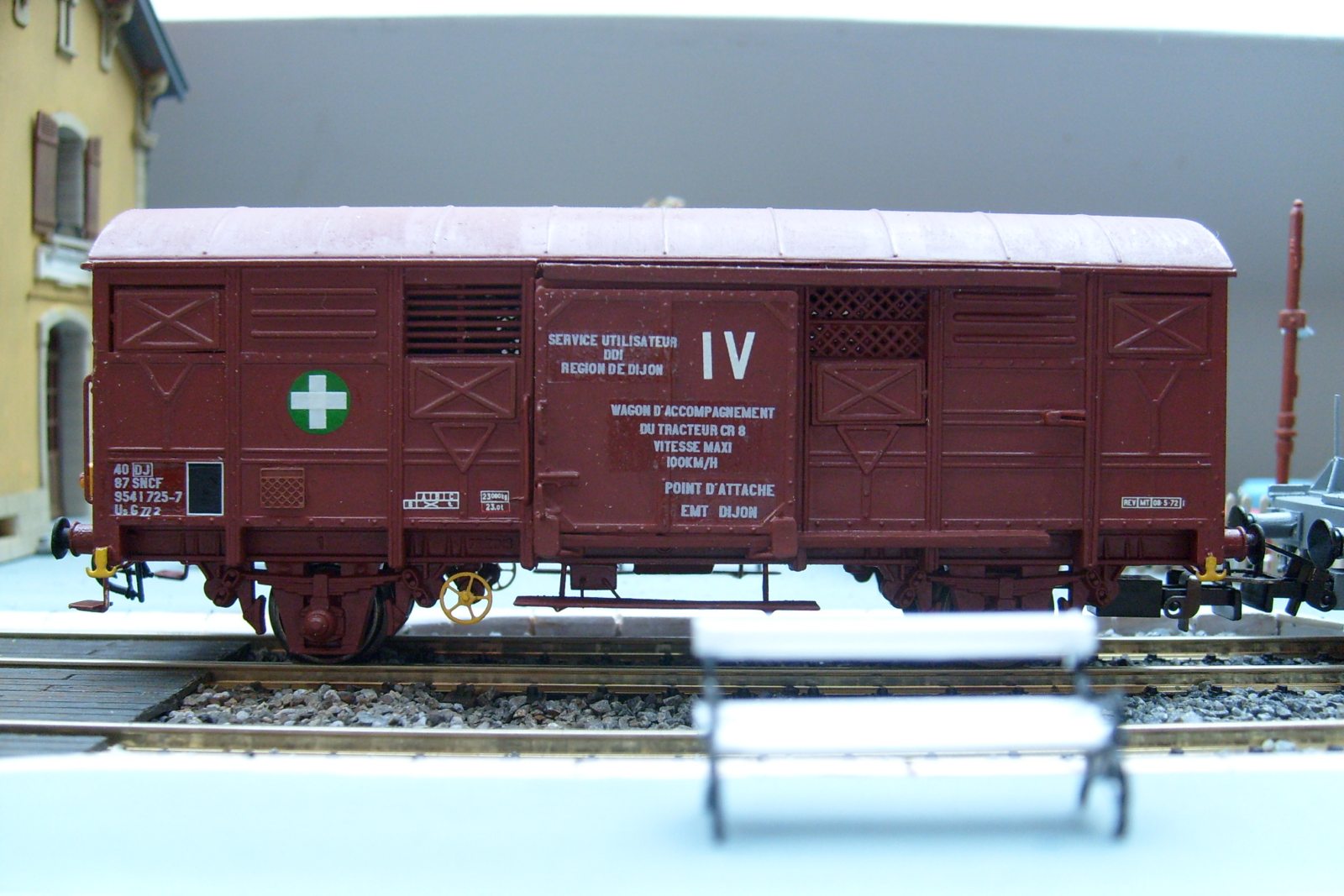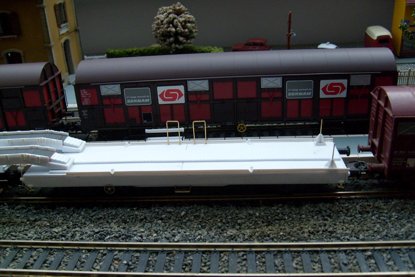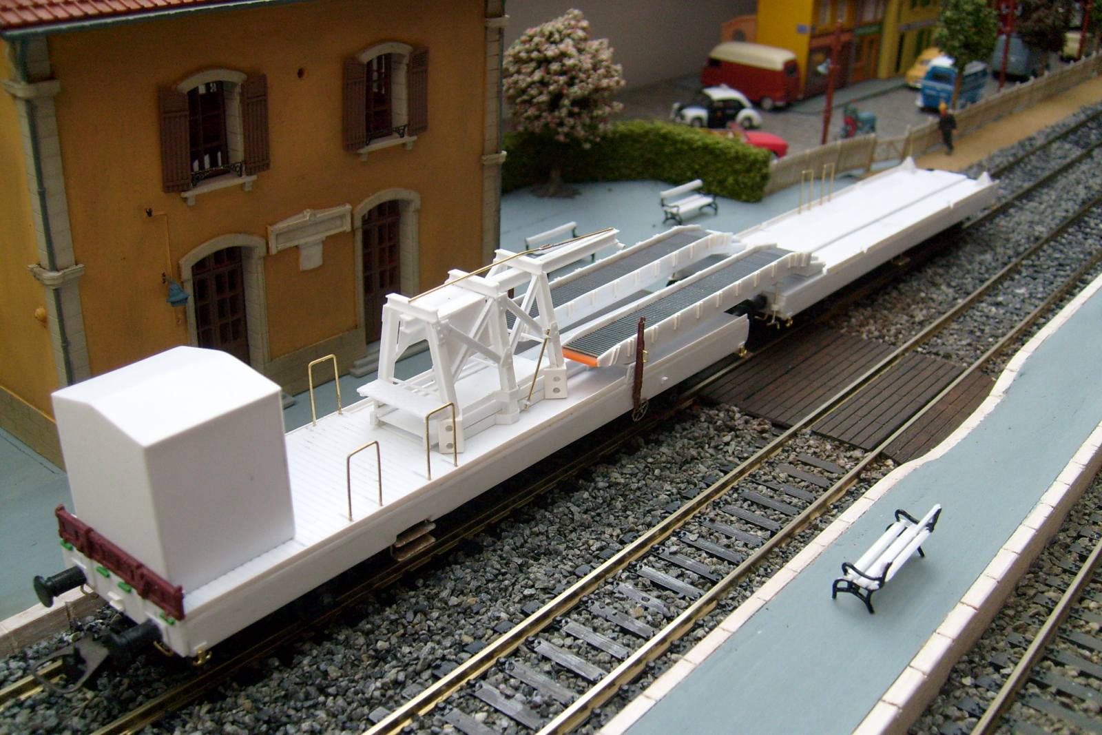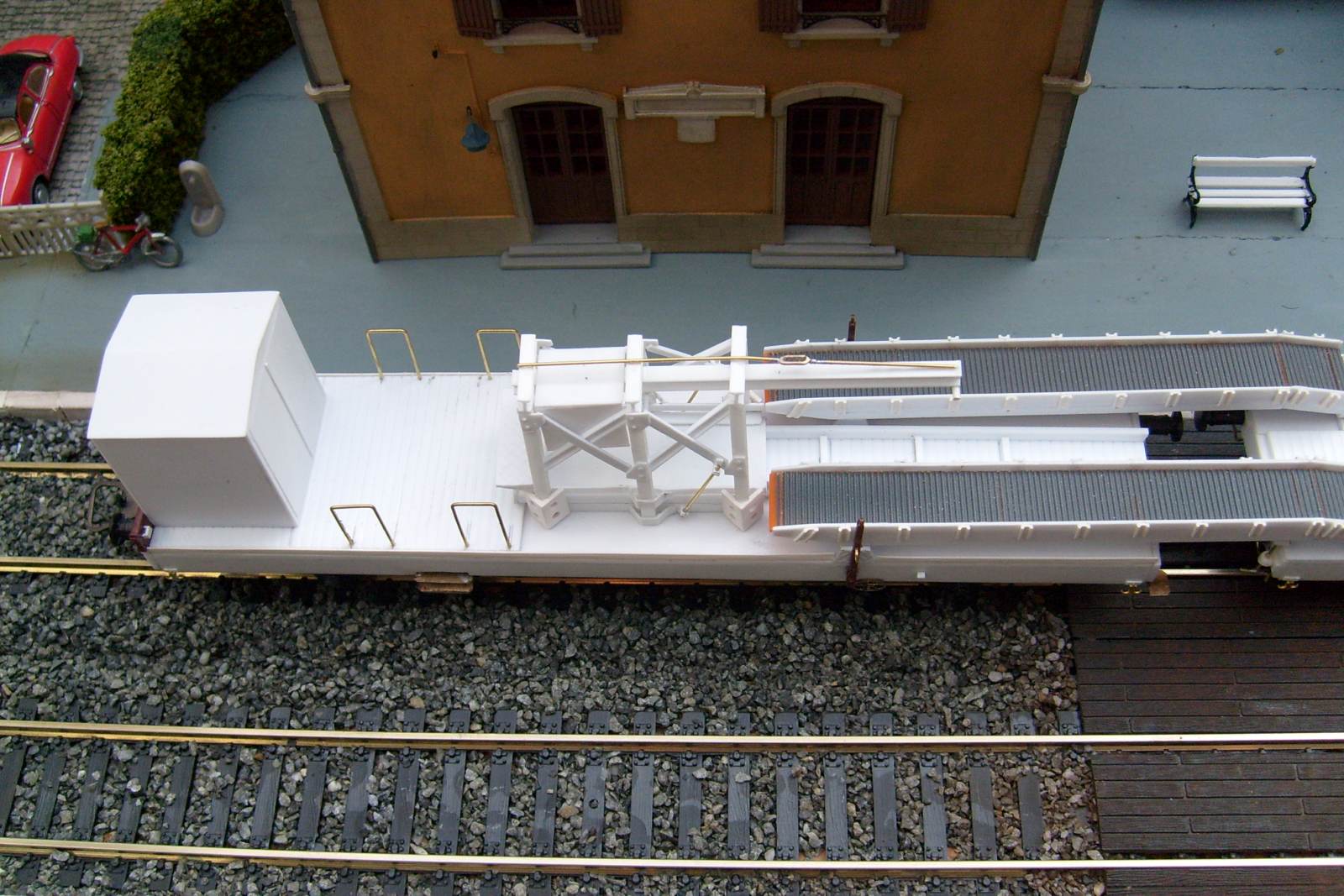 Les châssis sont faits maison et non des modèles du commerce comme je le pensais (le couplage est construit sur base de deux K50 en réalité), et les surfaces de roulement de la rampe d'accès sont tirées de persiennes de TGV Lima recyclé !