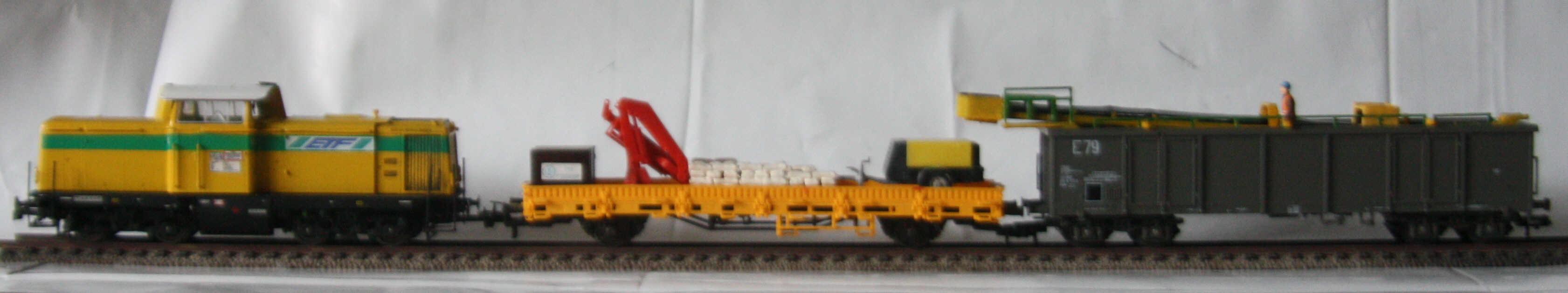 Les wagons plats sont des Piko (54827) sans leur chargement d'origine, le tombereau vient de chez Klein-Modellbahn (5322). le petit wagon jaune (Kibri) sert d'espacement et d'interface entre 2 types d'attelages.