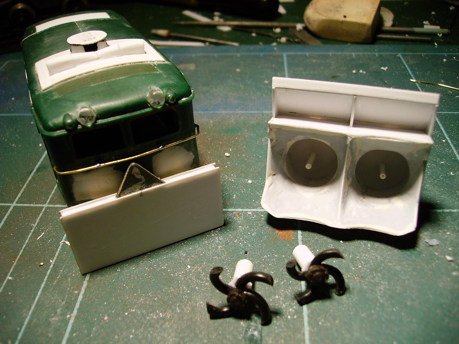 Pour DU65 voici le pontarlier en cours de montage.Pour te donner des références de plastique c'est un peu dur,car je ne note pas forcément et comme tu peux le voir j'utilise un peu de tout et n'importe quoi Je me suis basé sur un article d'un vieux Voies Ferrées ou il y avait quelques photos.Pour l'étrave du cn Lens c'est le même principe.