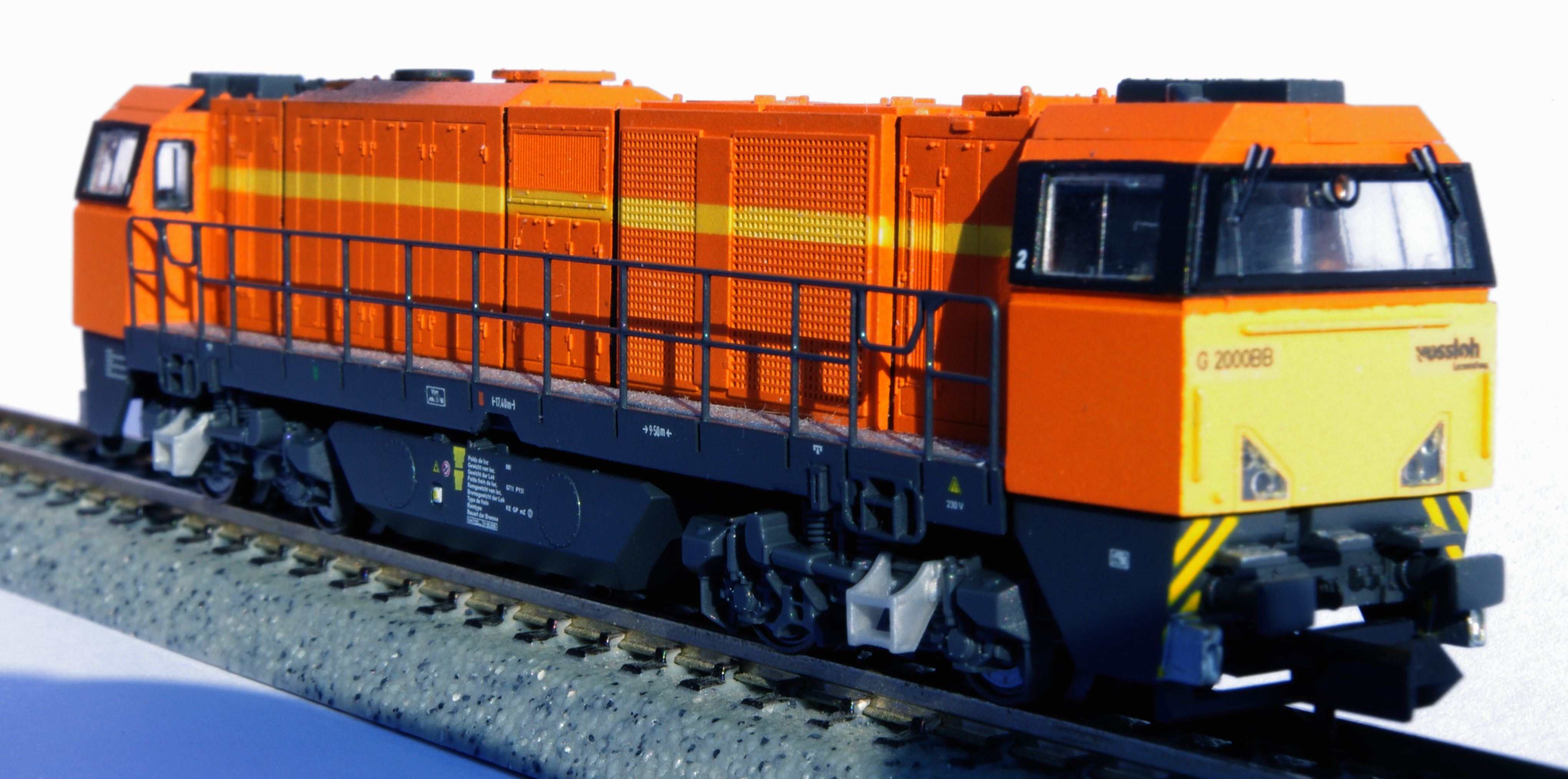 Voici une G2000 Méhano à l'échelle N redécorée aux couleurs de Colas-Rail.