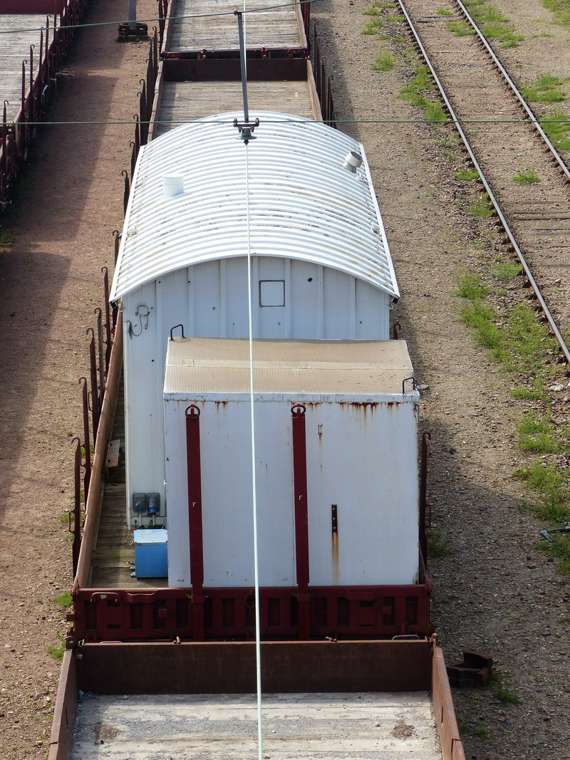 Voici le wagon plat à essieux 40 87 959 4 599-2 Us K55 1 F SNCF-CF Point d'attache Clermont-Ferrand avec un bungalow