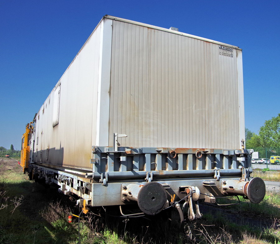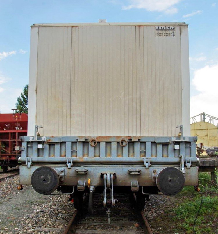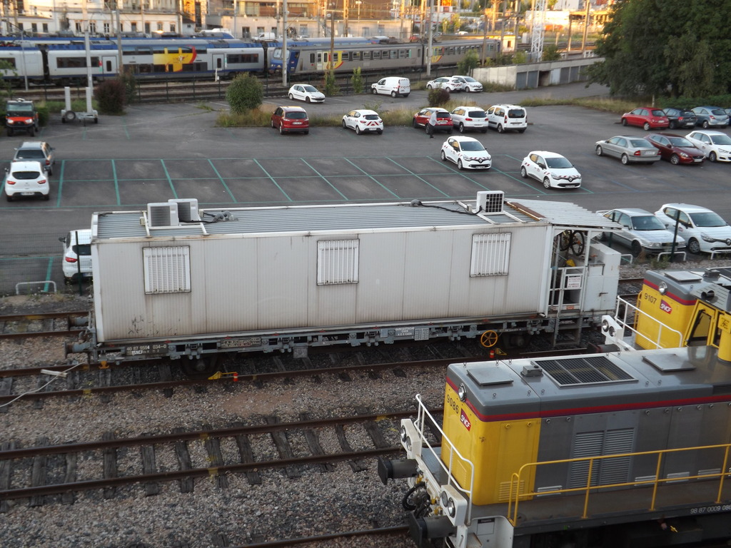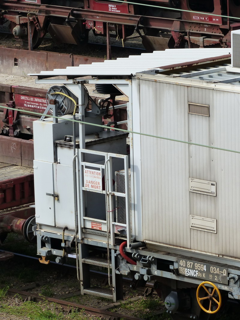 Voici le wagon plat à essieux 40 87 959 4 034-0 K55 2 F SNCF-RO gare d'attache Caen - AES Caen avec le 031-6 sur une rame Infra qui arrive