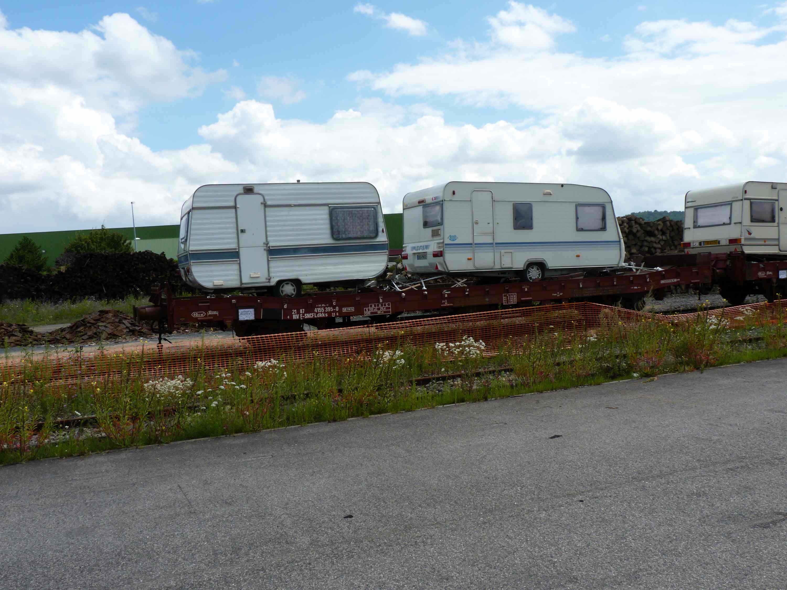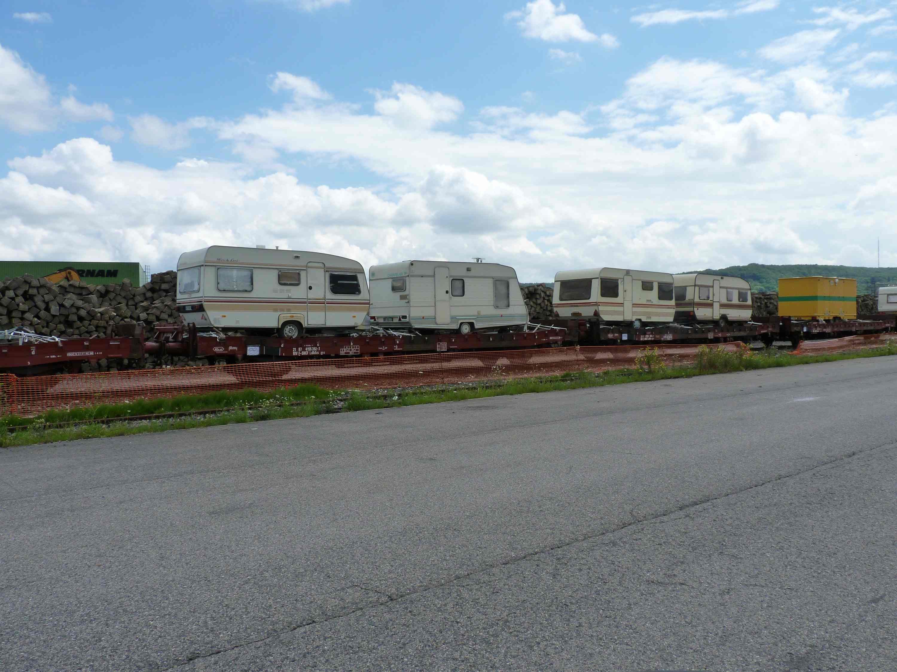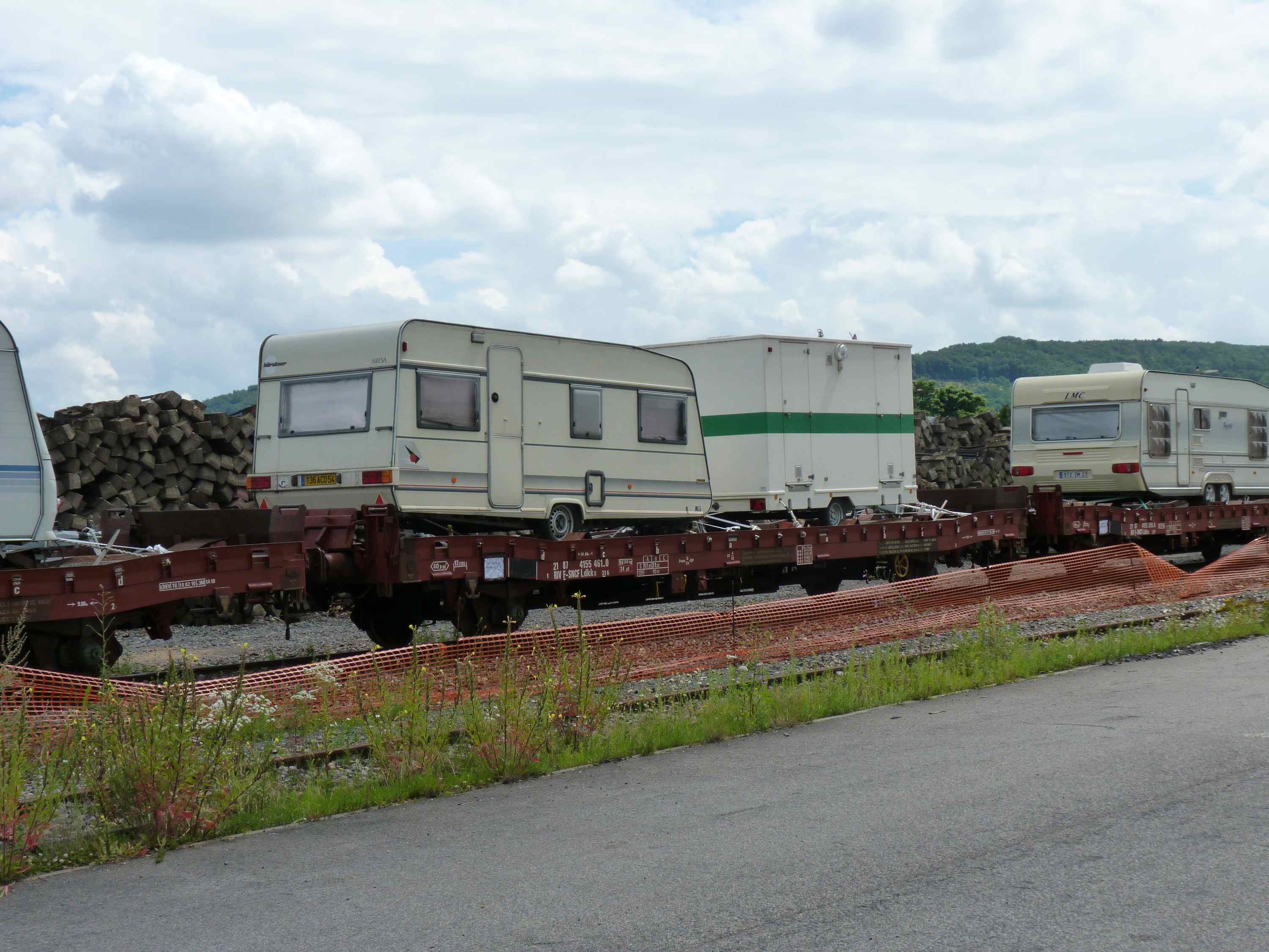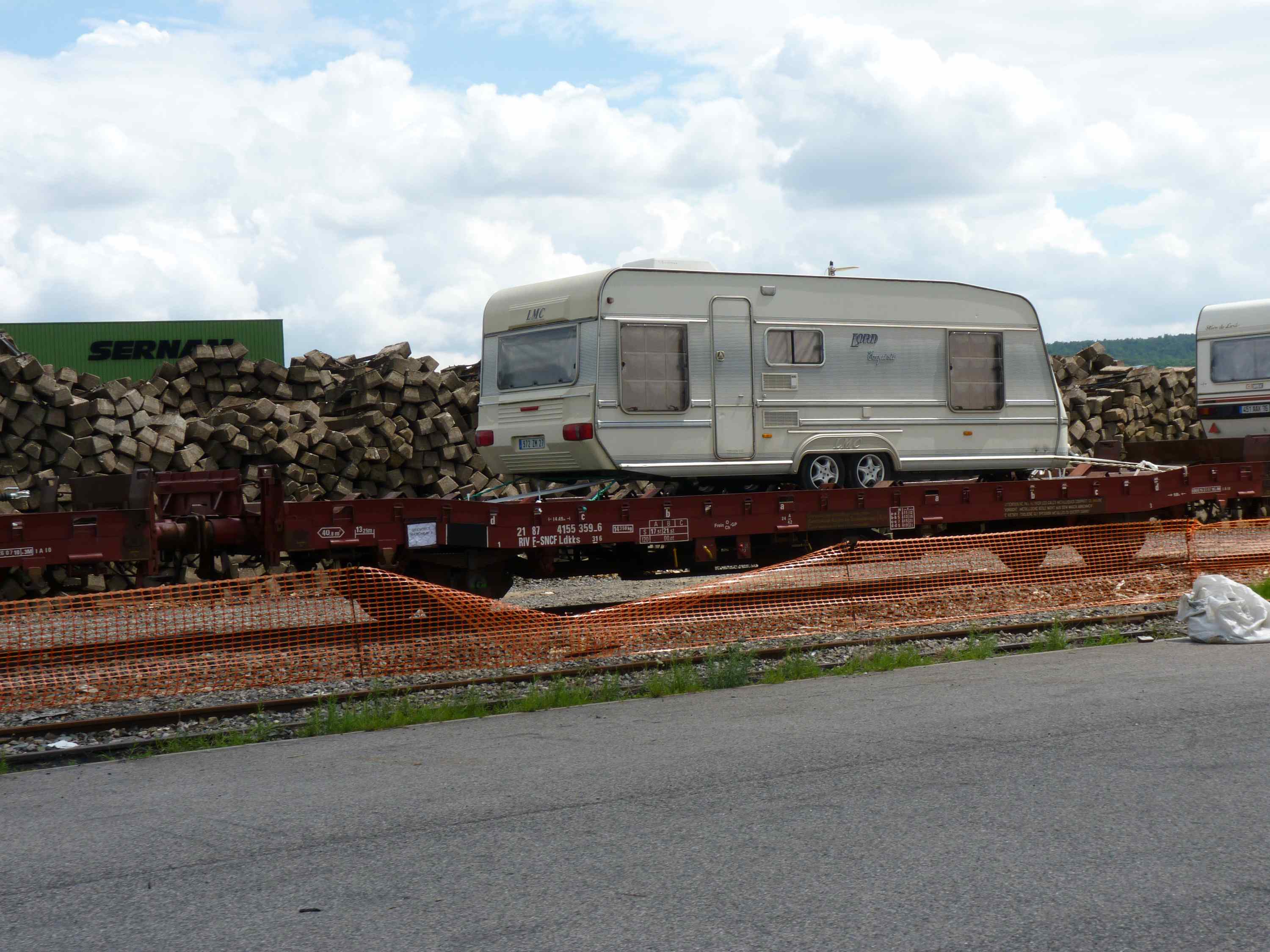 voici des photos de wagons plats SNCF Ldkks chargés de caravanes des intervenants ETF