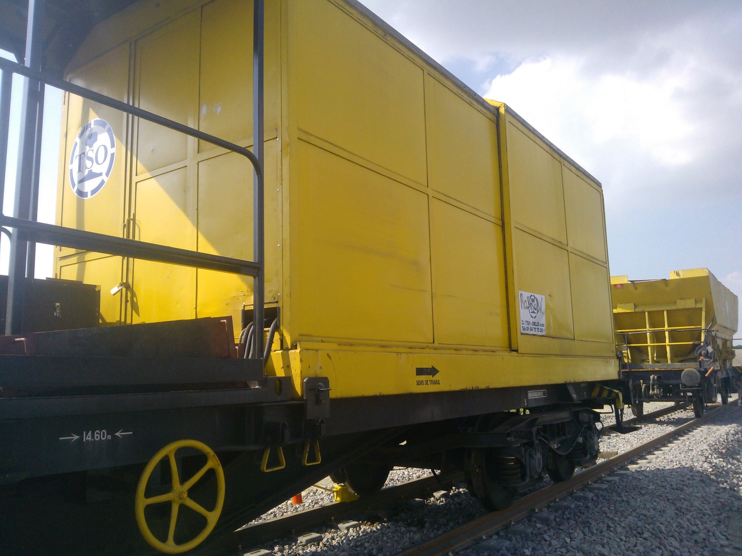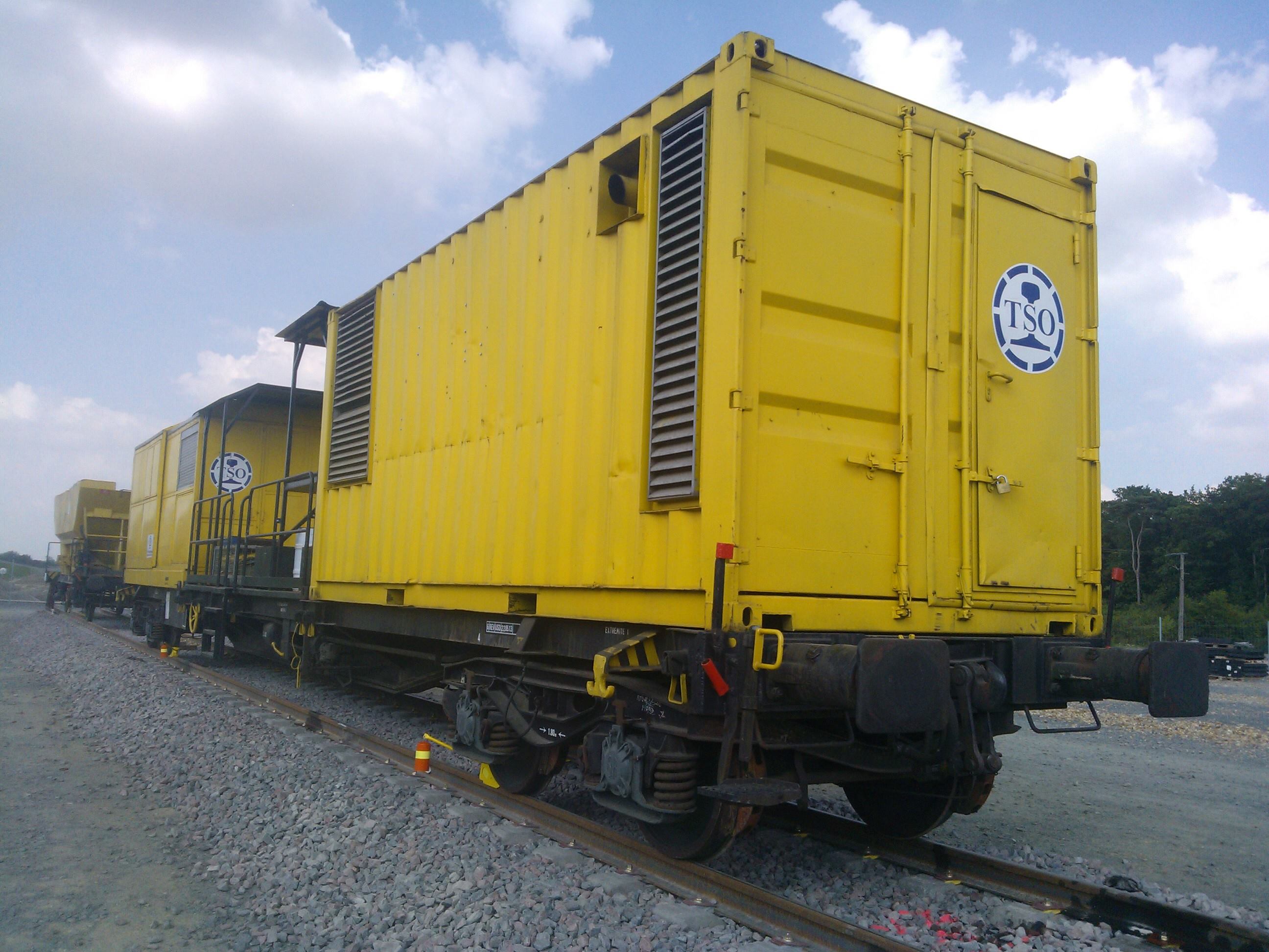 Ce wagon porte deux conteneurs: un pour le groupe électrogène et l'autre pour la tête de soudure électrique qui doit être montée sur une grue ou une chèvre.