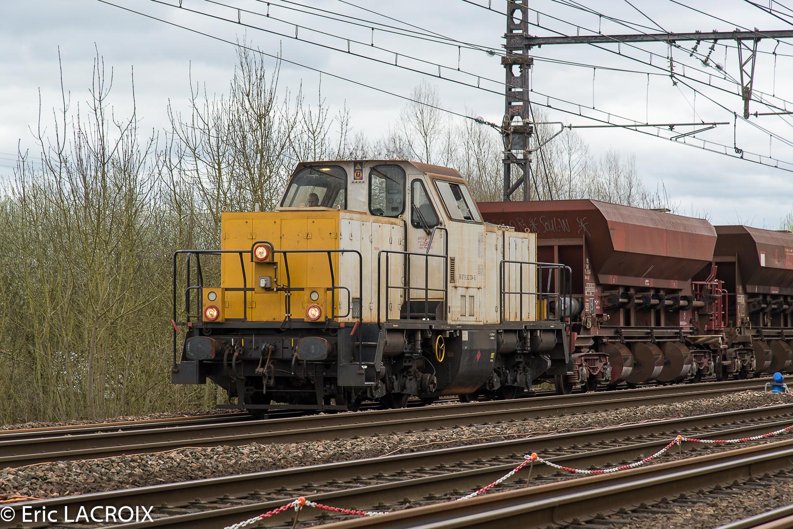 BR 214 Delcourt 99 87 9 182 704-6 pousse trois ballastiéres et deux couplages de wagons grues BRRAS Transalp Renouvellement à Villeneuve la Guyard le 20 mars 2017.