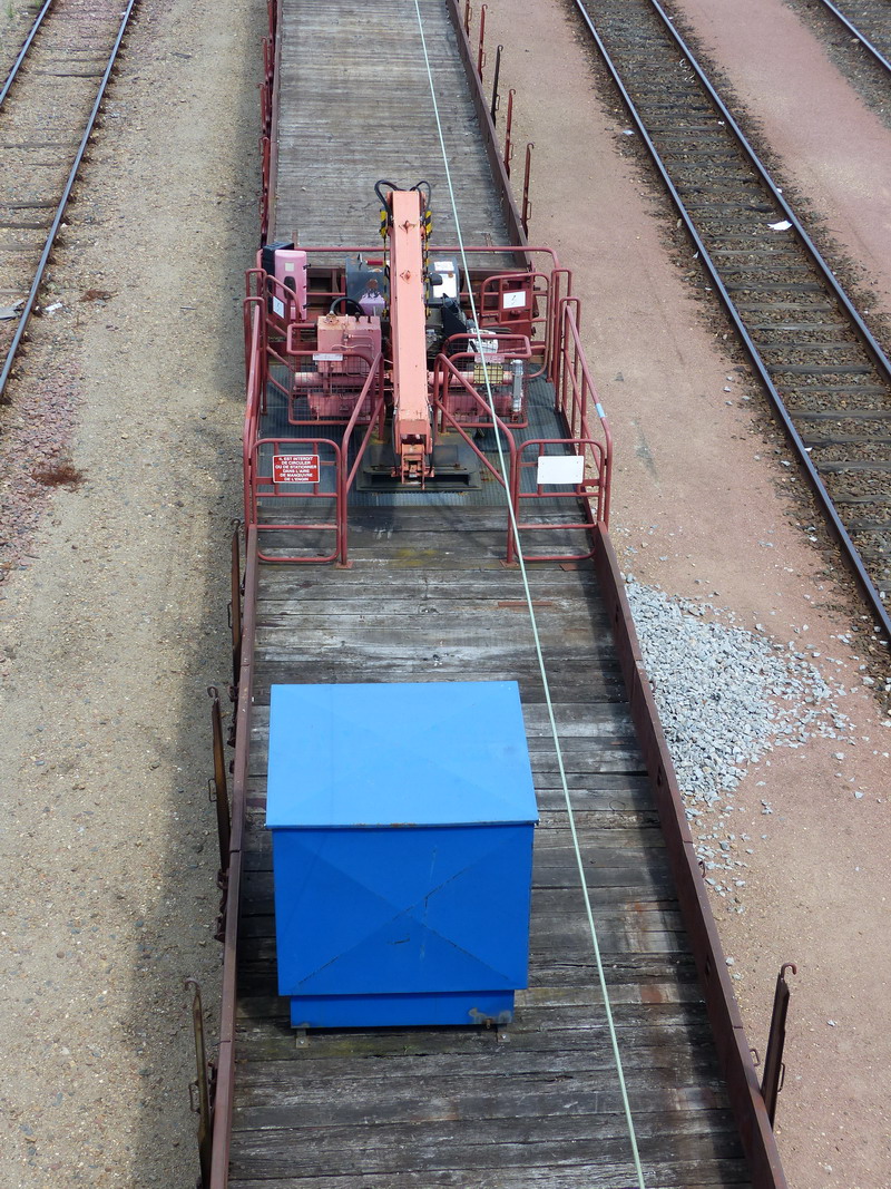 Voici le wagon 80 87 979 6 100-6 Uas - SNCF-LY avec sa grue benne ATLAS d'E.C.V.I Ã Ludres 54