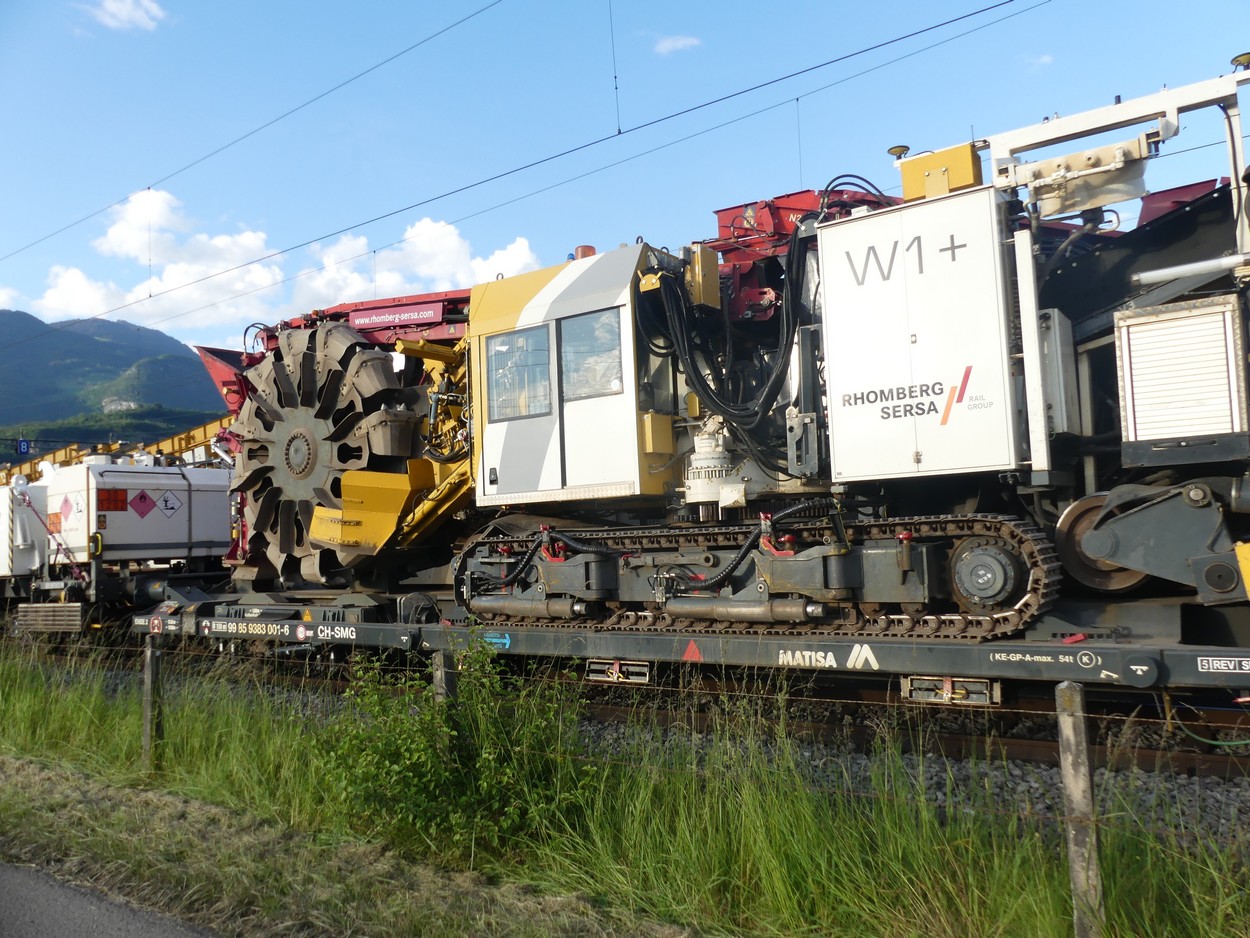 Voici la cribleuse W1+ de Rombherg Sersa Rail Group. Cette machine sur chenille roule également sur rails grâce à des bogies relevables. Elle est transportée sur un wagon surbaissé.