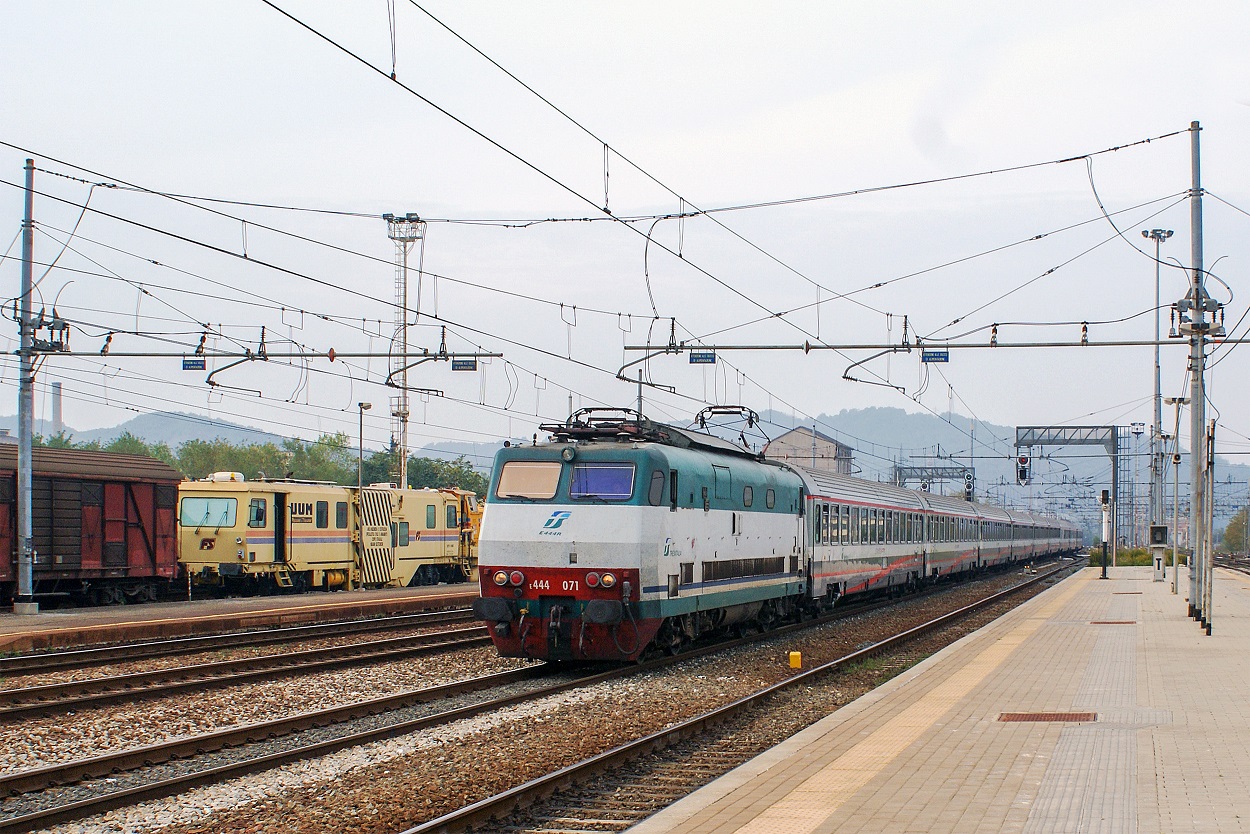 Bonjour, j'ai trouvé par hasard cette photo. L’intérêt pour moi n'étant pas la locomotive E444R en tête du convoi, mais plutôt la rame garée. On voit une machine Plasser UUM (1988) avec vieux logo à losange FS (aujourd'hui RFI). Il s'agit apparemment d'une sondeuse de plateforme. J'ai vu qu'un modèle Matisa existe aussi en France chez ETF, mais j'ai trouvé peu d'information sur ce type de machine.