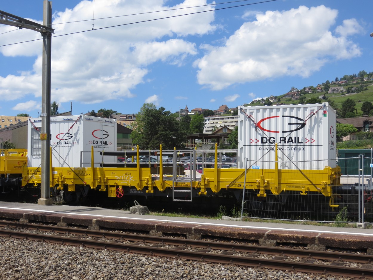 Wagon plat à bogie de Duvoisin Groux avec deux conteneurs. le wagon à été modifié pour en faciliter l'accès.