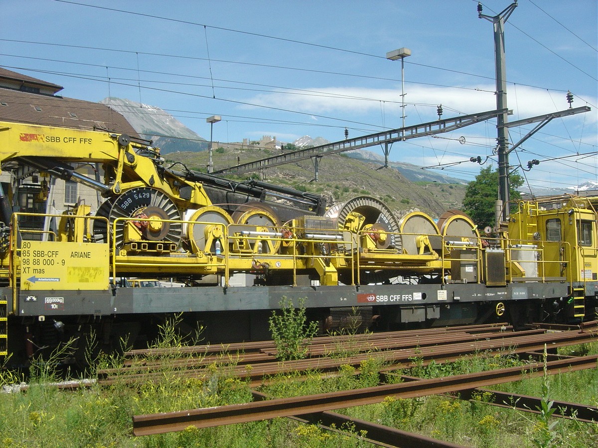 la voici à Sion en 2007. je n'ai pas de photos récente. Elle est utilisée avec plusieurs engins nacelles pour renouveler les caténaires ou en poser de nouvelle sur des distances souvent très longues.