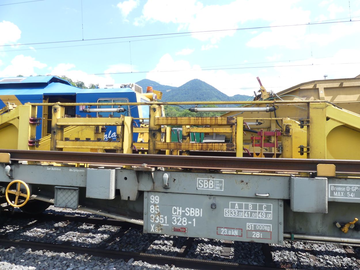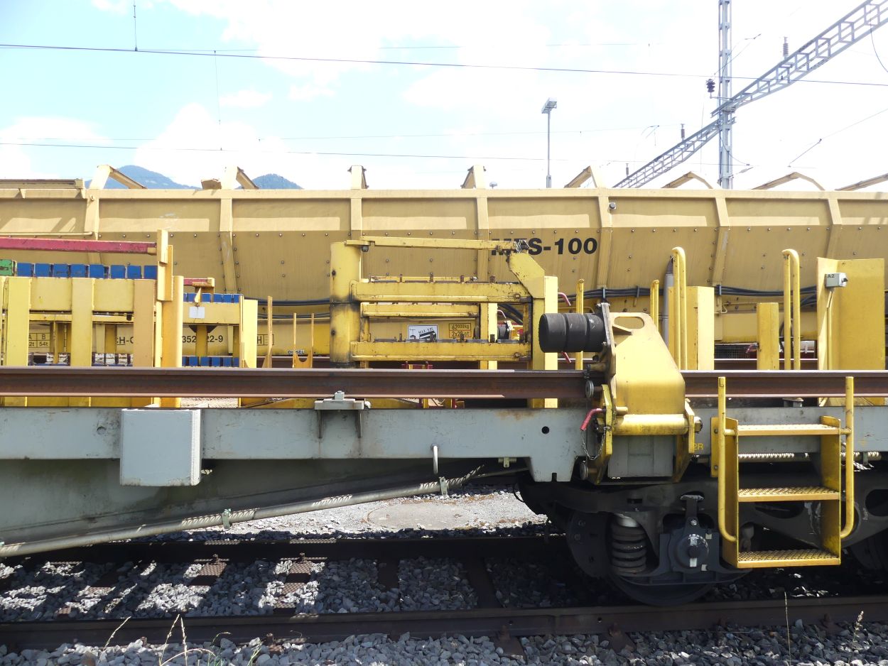Voici l'un des trains de transport de longs rails de 108 m, numéro 13. Ces trains peuvent transporter des longs rails soudés de 108 m maximum, la longueur utilisée en Suisse.