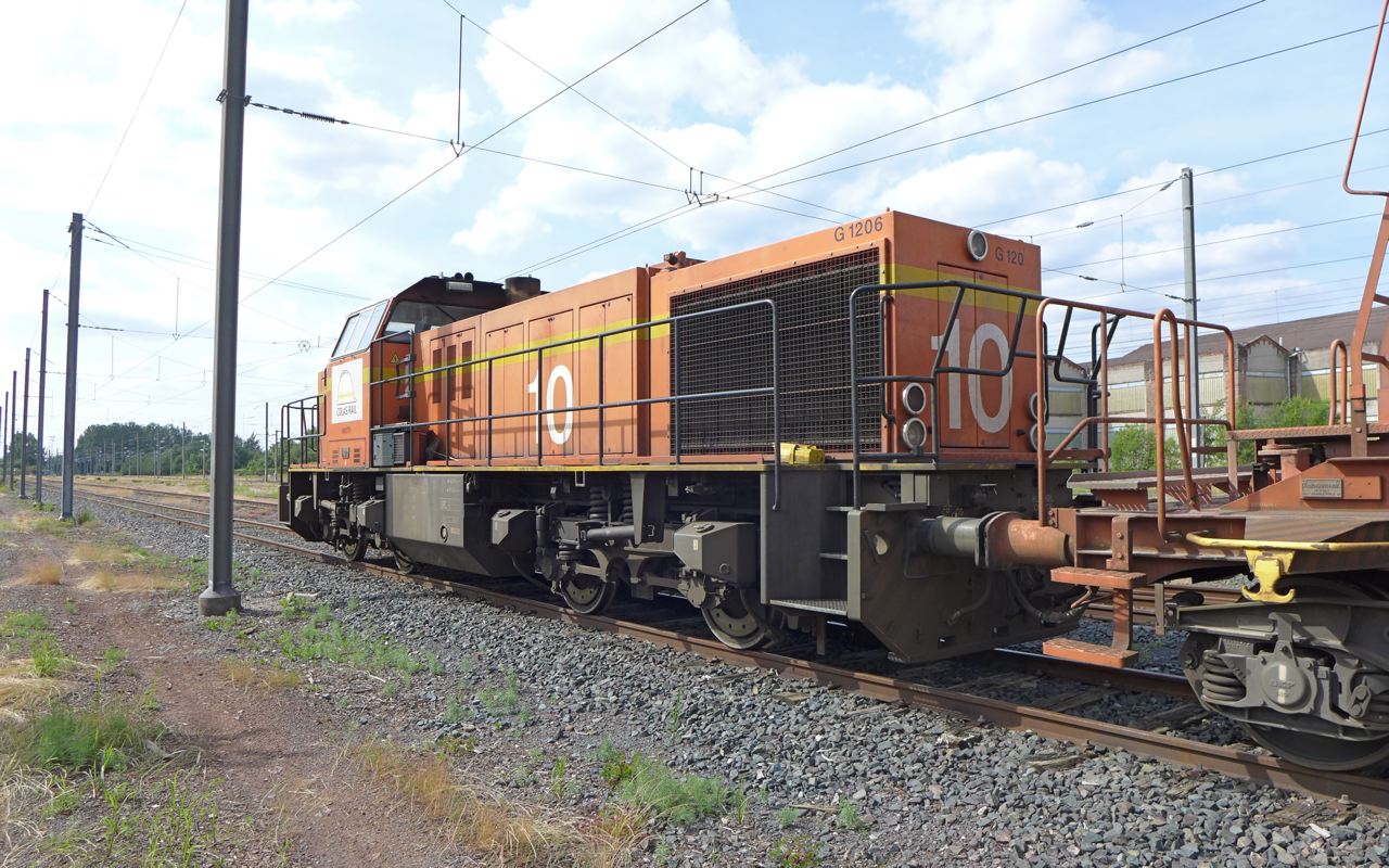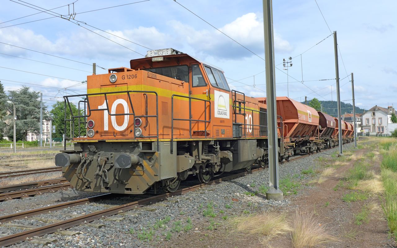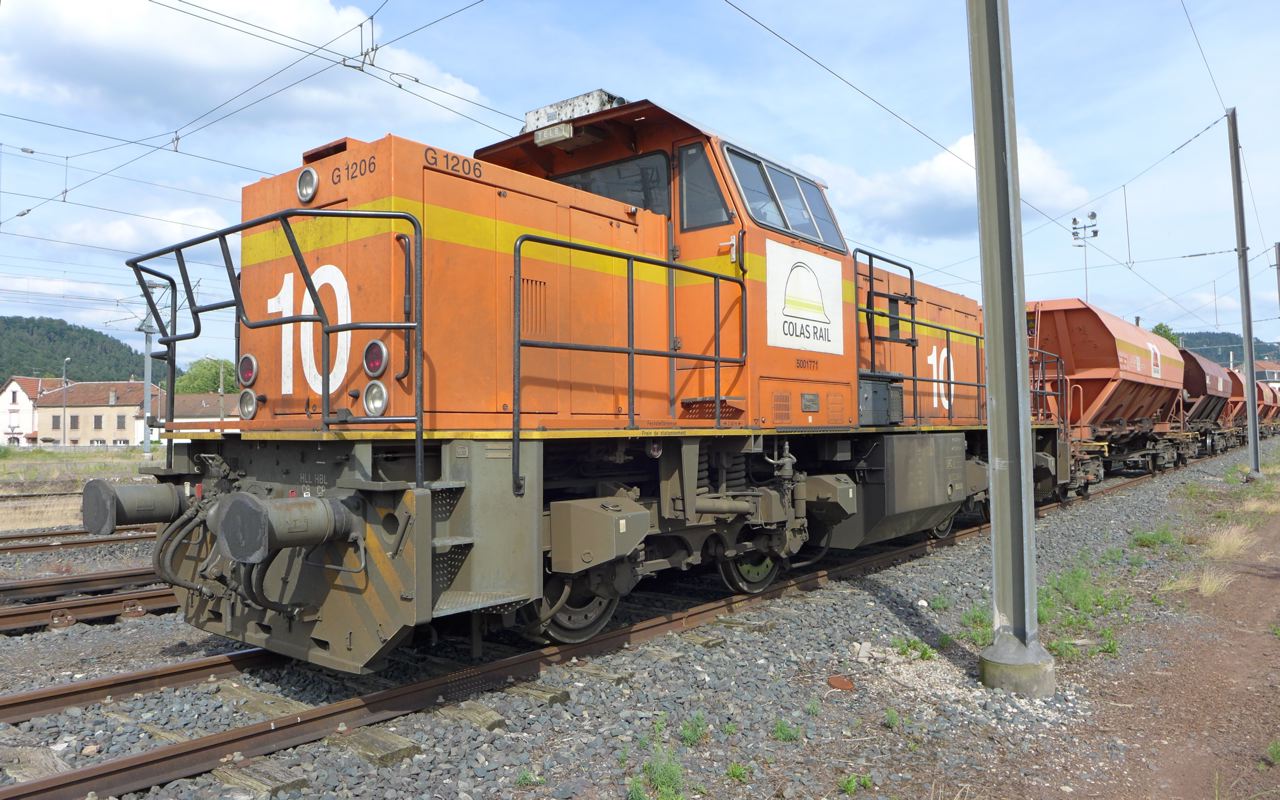 Voici la Mak G 1206 BB 5001771 Colas Rail 10 (25-03-2007) en tête avec la G 1206 BB 5001773 Colas Rail 12 sur une rame de tombereaux F28 pour une base de travaux de la LGV SEA