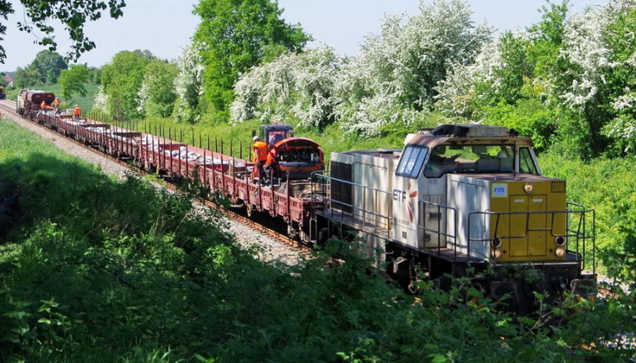 La voici entre la gare de Jussy et les ponts de Bray (02) sur une rame de TTX pour la finition sur le RVB Amiens Laon