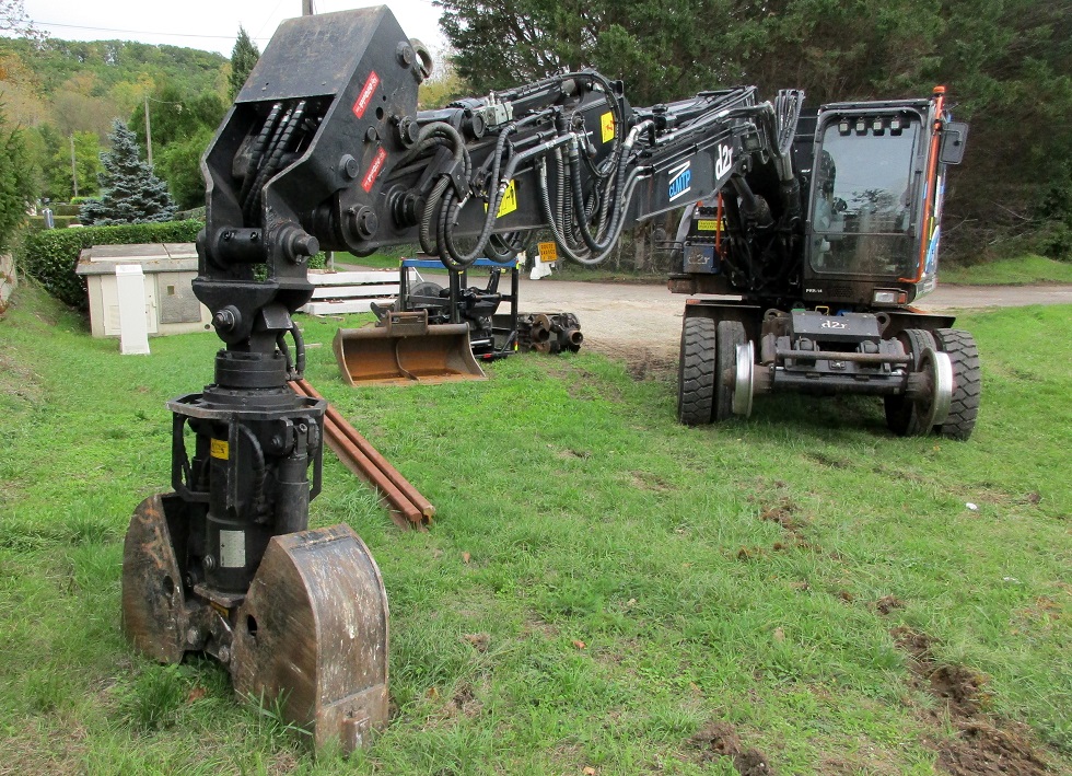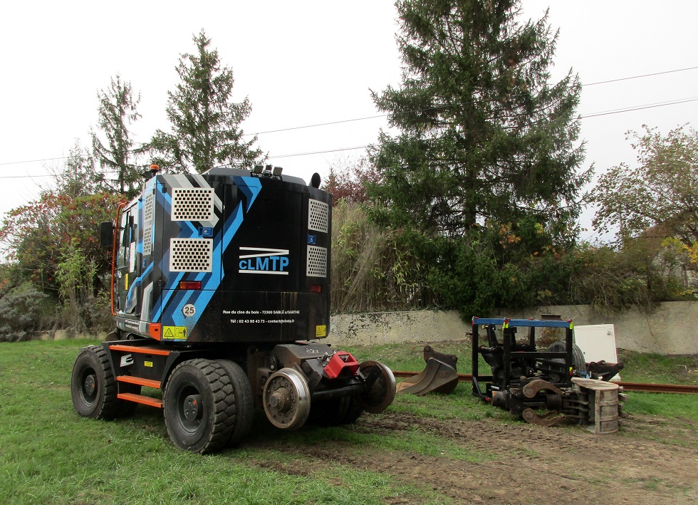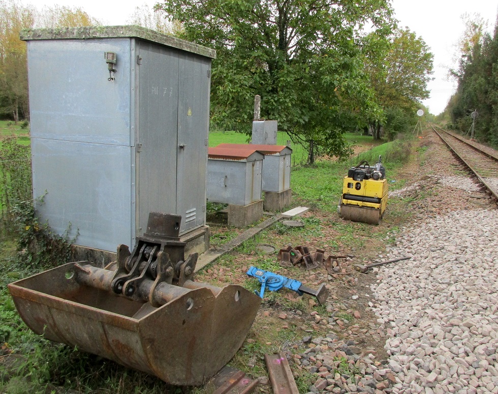 Au lieu-dit Cornillé sur la commune de Chambourg sur Indre (37 - Indre et Loire), des travaux de réfection sont en cours au PN 77 (PK 279,699 ligne Tours Loches). Une équipe SNCF travaille conjointement avec du personnel de l'entreprise CLMTP (CLAISSE Location Matériel Travaux Publics basée à Solesmes près de Sablé sur Sarthe dans le 72 - Sarthe). Une PRR "d2r ZX 170-6" est sur place pour déposer le vieux ballast, les traverses bois et les coupons de rails DC de part et d'autre du PN avant le remplacement par du ballast neuf, des traverses bétons et du rail UIC :