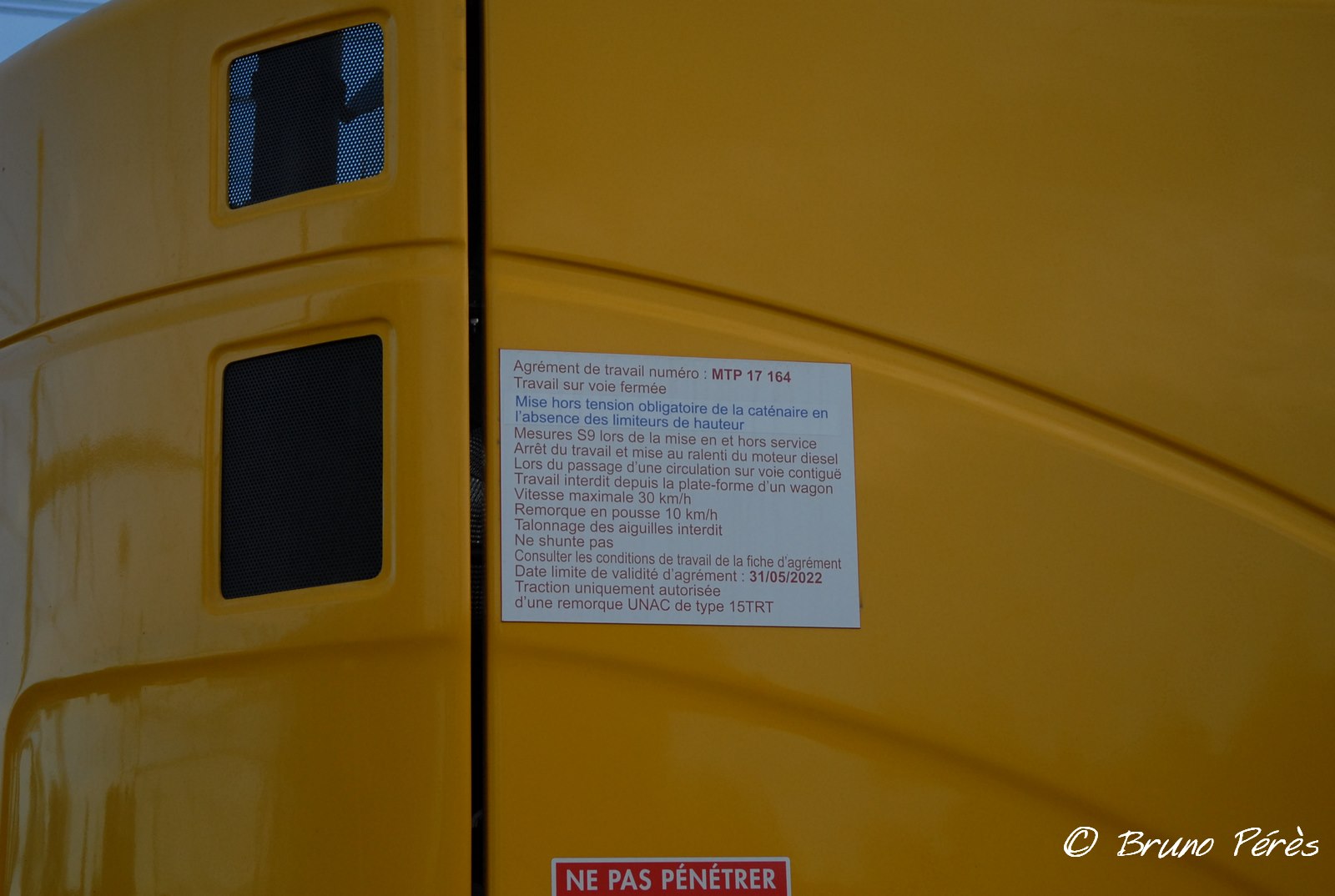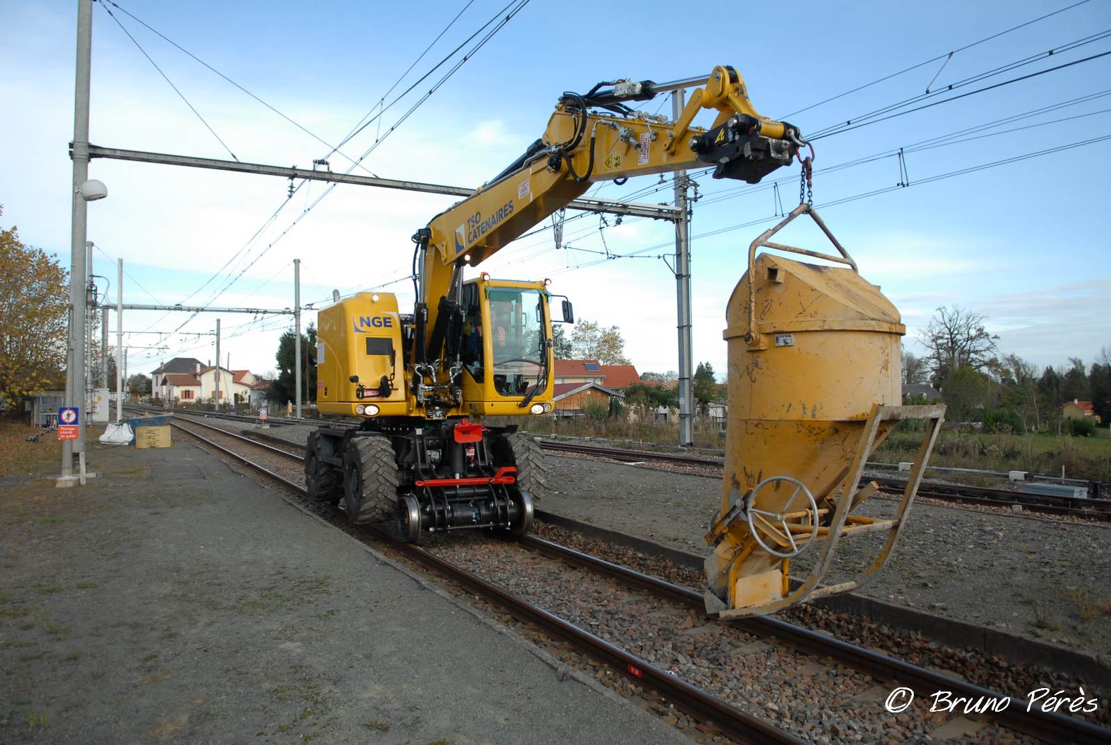 Elle est vue sur le chantier de pose de poteaux caténaire sur la ligne Toulouse-Tarbes le 03/11/2017, en gare de Capvern (65).